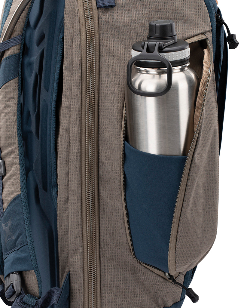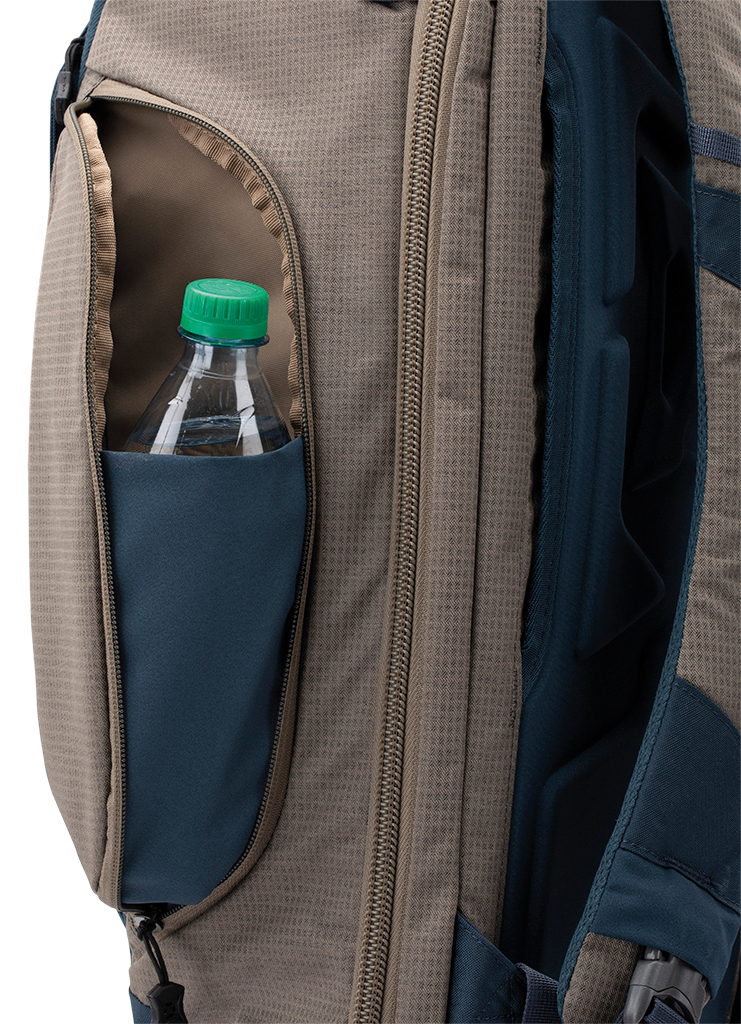 2 zippered side compartments open to the body for improved security and can hold large water bottles or similar sized items.