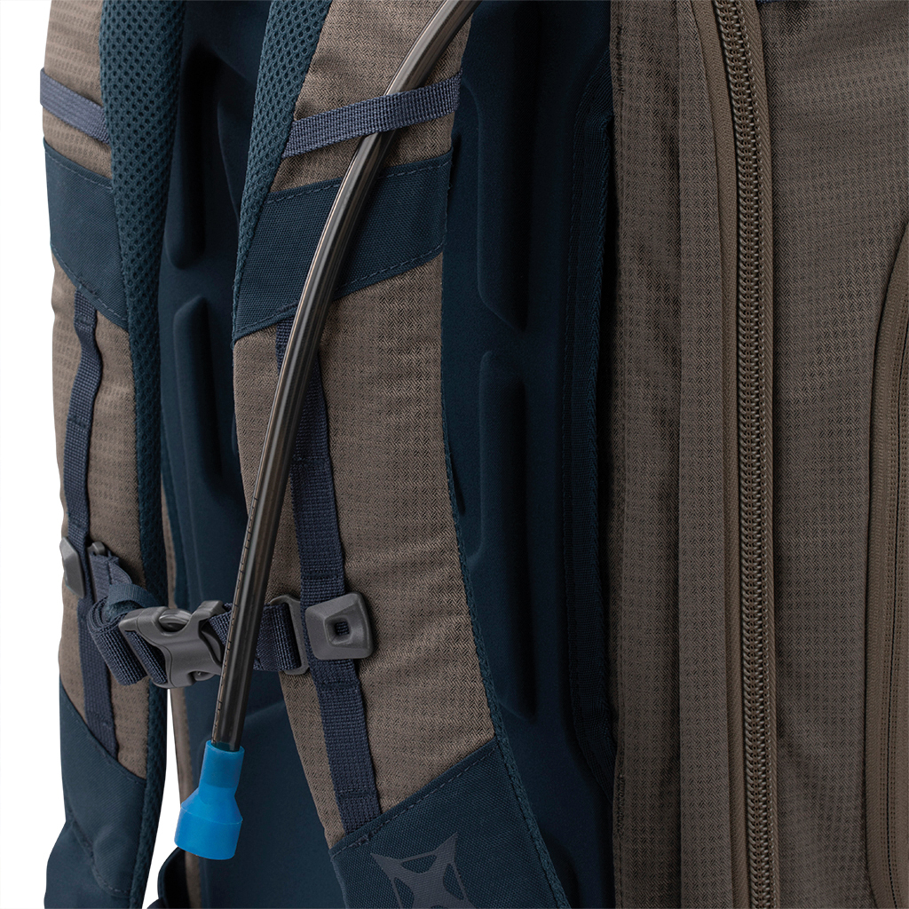 Modular padded laptop sleeve in main compartment is adjustable in size and position and can also be used as a protective sleeve for weapons or sensitive gear.