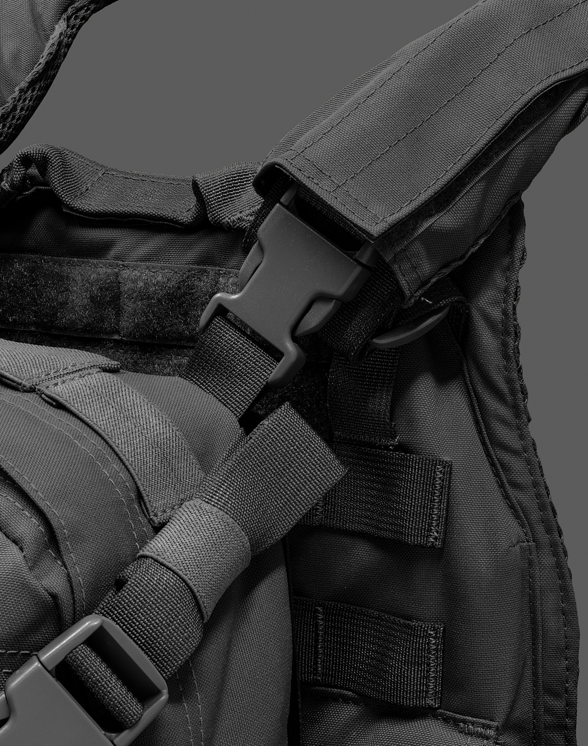 The HCP can be worn with 2 padded, removable shoulder straps, or if these are removed, the HCP can be attached to the back of a plate carrier, such as DCS or RPC, with MOLLE loops.