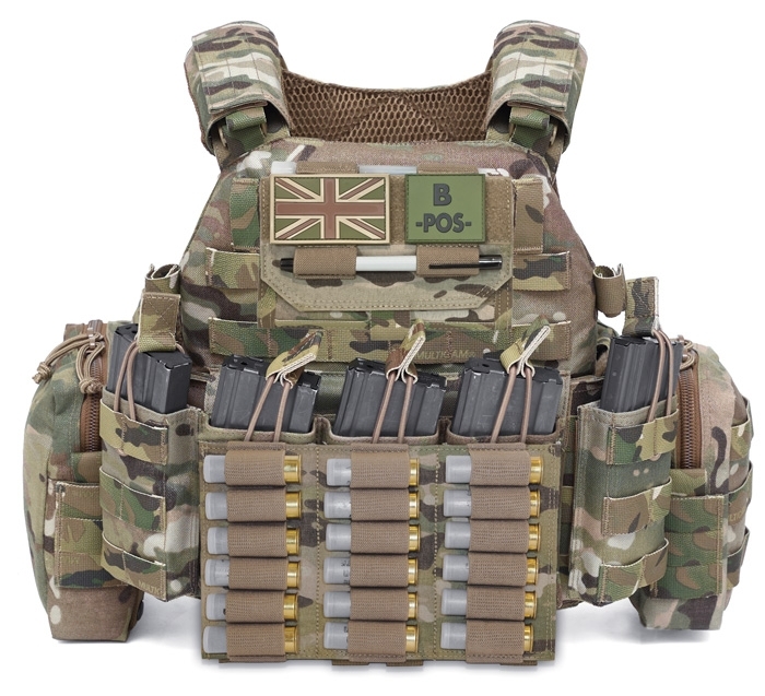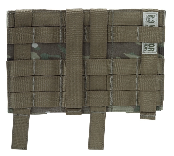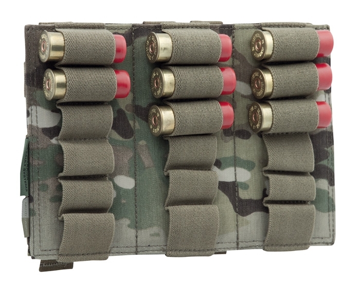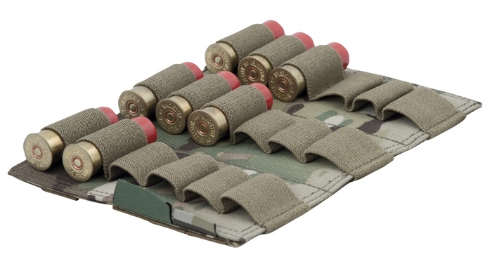 Modular panel to hold 18 shotgun shells to loop onto the front of a Warrior Elite Ops plate carrier (such as DCS, RICAS, etc.). Optionally, the panel can also be attached to a Triple Mag Pouch.