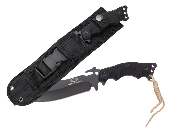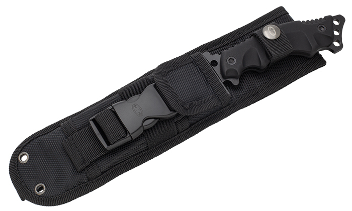 With strong, MOLLE-compatible nylon sheath with front pocket.