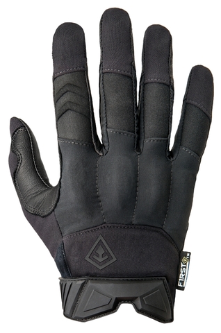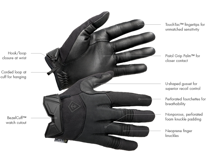 The Medium Duty Padded Glove from First Tactical™ provides fingertip sensitivity and tactility and lightweight protection with a back of hand pad. The palms are made of soft, thin goatskin and the back of the hand is made of a breathable stretch material with foam padding. TouchPoint™ touchscreen feature in the tip of all fingers and BezelCuff™ watch cutout on the rubber reinforced wrist hem.
