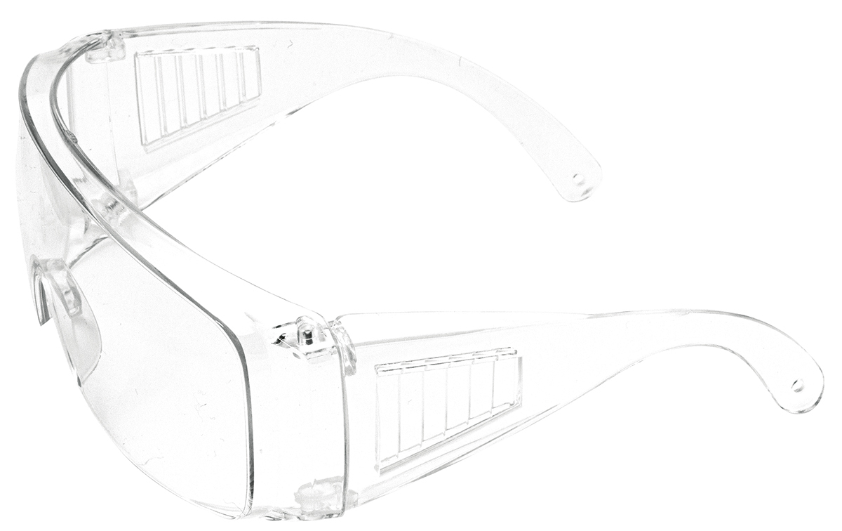 Safety glasses with lightweight polycarbonate lenses and molded side shields and brow guards, can be worn alone or over prescription glasses.