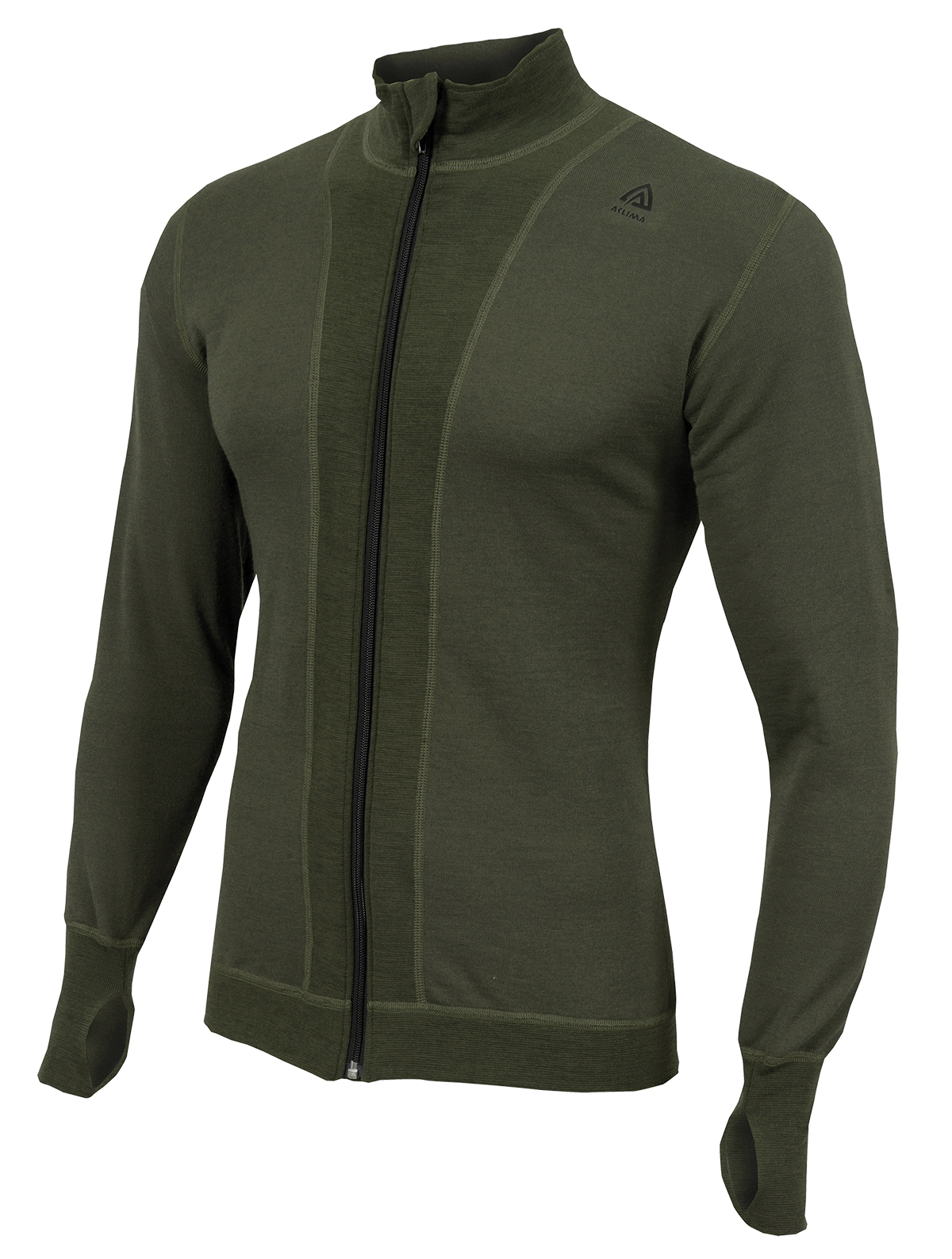 Aclima HotWool cold weather jacket made of 230 grams of wool terry with full front zipper and cuffs with thumb grommet.