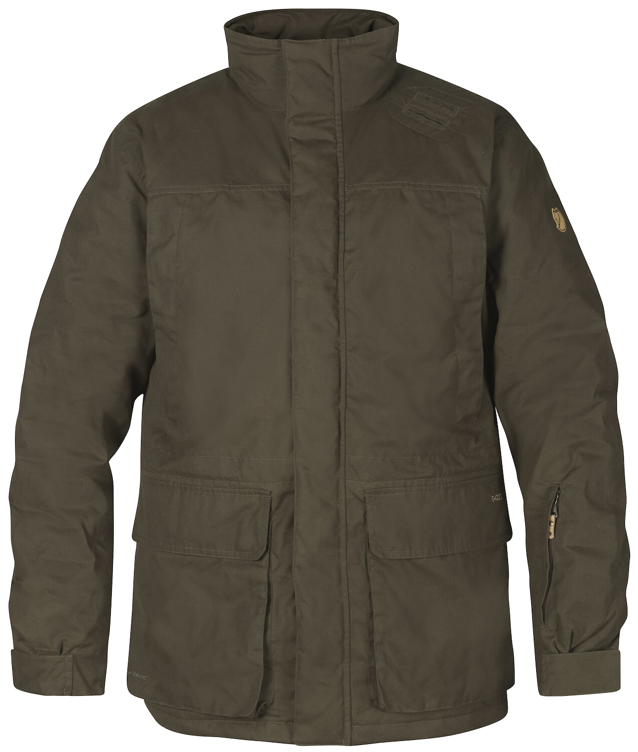 The Fjaellraeven Brenner Pro Padded Jacket is a warm, water-repellent jacket in soft, quiet G-1000® Silent Eco with clip-on radio holder and many pockets, including an ammunition pocket on the left sleeve.