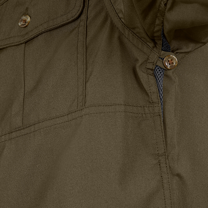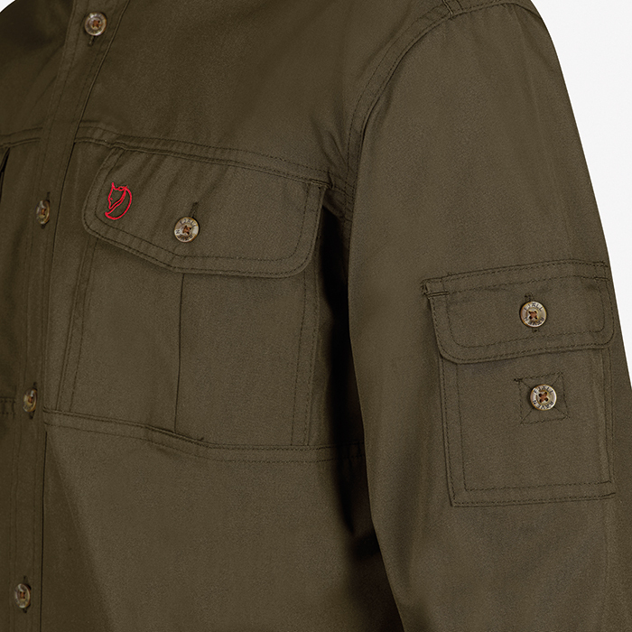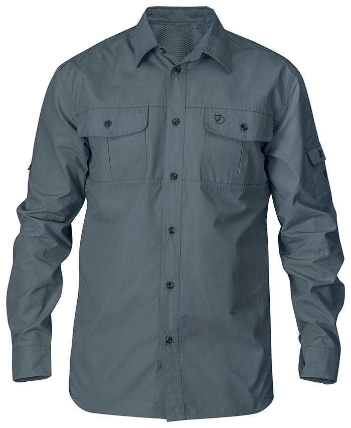 Fjaellraeven Singi is a particularly durable, versatile shirt with a regular fit, designed for trekking and other outdoor activities. Made of unwaxed G-1000 Original, which has been pre-washed for a soft feel. The material wicks moisture away from the body and dries quickly. The result: maximum comfort during sweaty activities. excess heat can escape through the mesh panels under the arms and under the back yoke. Two chest pockets and one sleeve pocket, all with buttoned flap. Buttons to secure the rolled-up sleeves