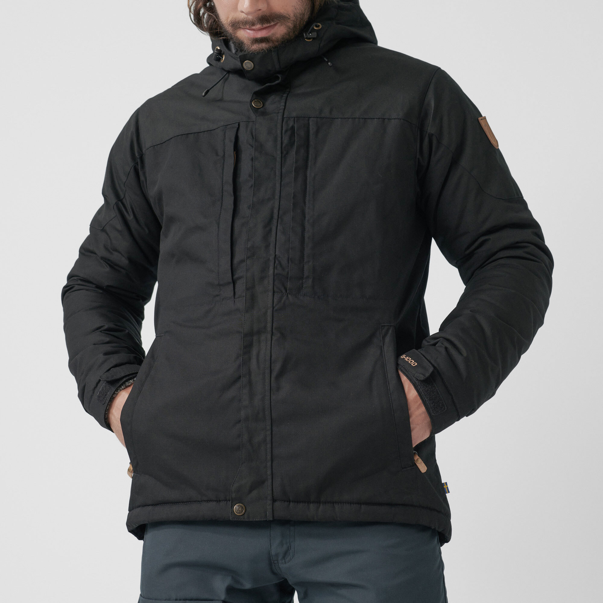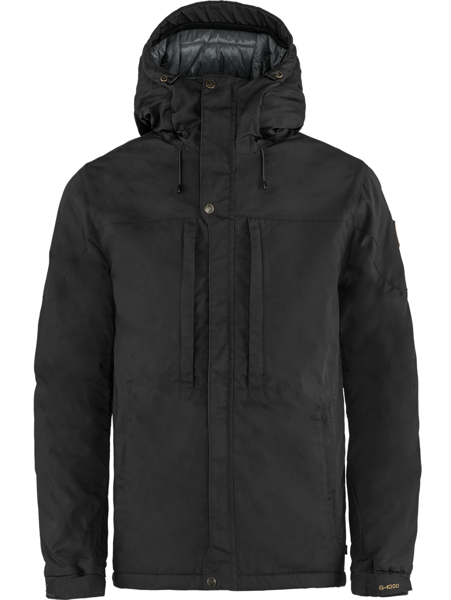 The Fjaellraeven Skogsoe Padded Jacket is a hHip-length, lightly lined winter jacket in G-1000® with attached adjustable hood. The perfect outdoor garment for the cold months of the year. It is wind-resistant and easily keeps out short rain showers, while allowing moisture formed on the body to escape. The synthetic fiber filling G-Loft Supreme provides cozy warmth even in cold and damp conditions. In addition, the jacket offers good freedom of movement with and without a backpack on the back. The sleeves are pre-shaped, and the cuffs can be adjusted with snaps. The two-way front zipper is located behind a wind flap, which is fixed at the chin, at chest level and at the hem by press studs. Several handy pockets: two vertical pockets at chest height and two at the sides - all have zippers with oversized zipper handles that are easy to grip even with gloves. Two roomy interior mesh pockets with space for gloves or a hat round out the functionality. Drawcord to adjust the hem width