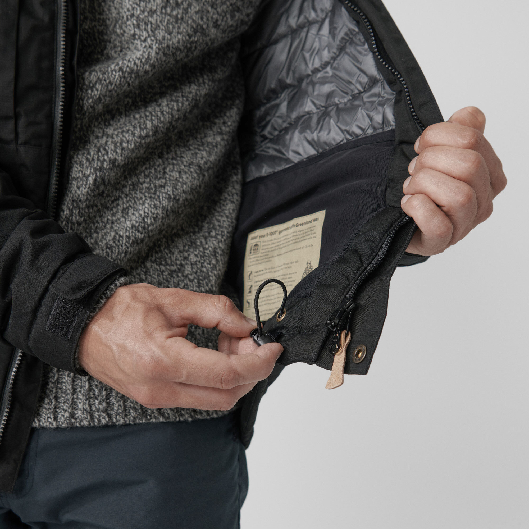 Hip-length, snug fit and pre-shaped sleeves.
