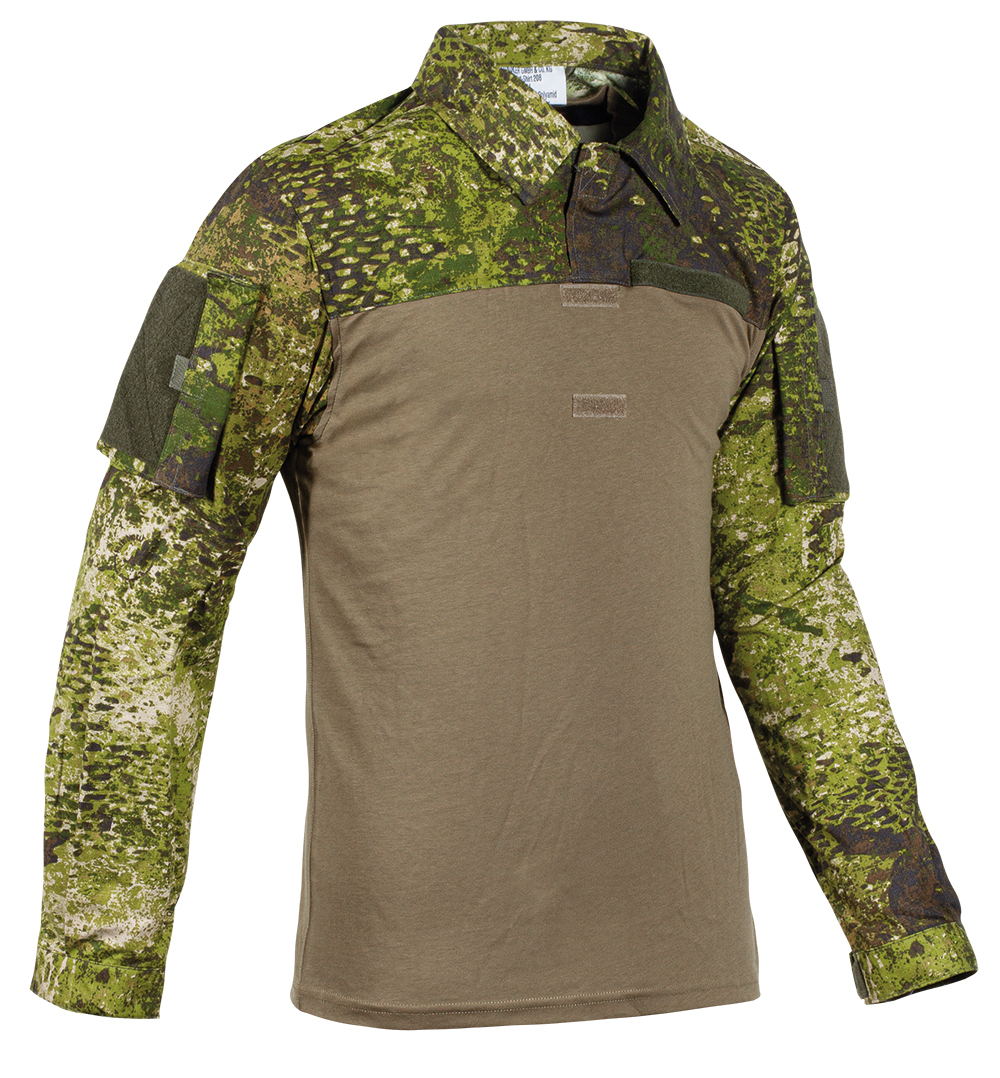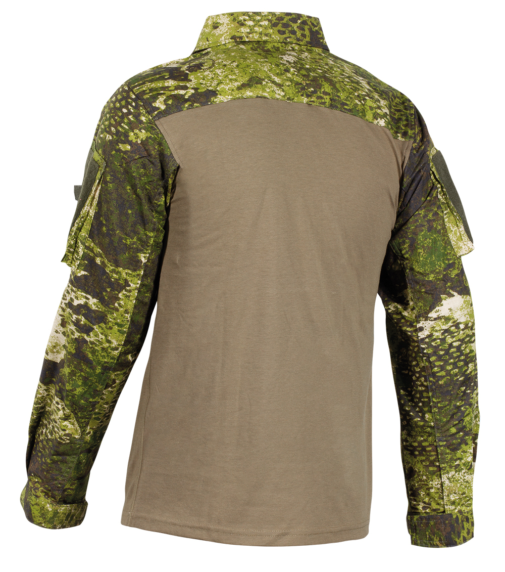 Designed to be worn under body armor, the Combat Shirt from Leo Koehler is a hybrid of a tropical undershirt coupled with the sleeves of a field blouse. The sleeves and shoulder sections are particularly durable due to the ripstop blended fabric. Manufactured by Leo Koehler GmbH & Co KG in the original PhantomLeaf camouflage pattern WASP Z IIIa.