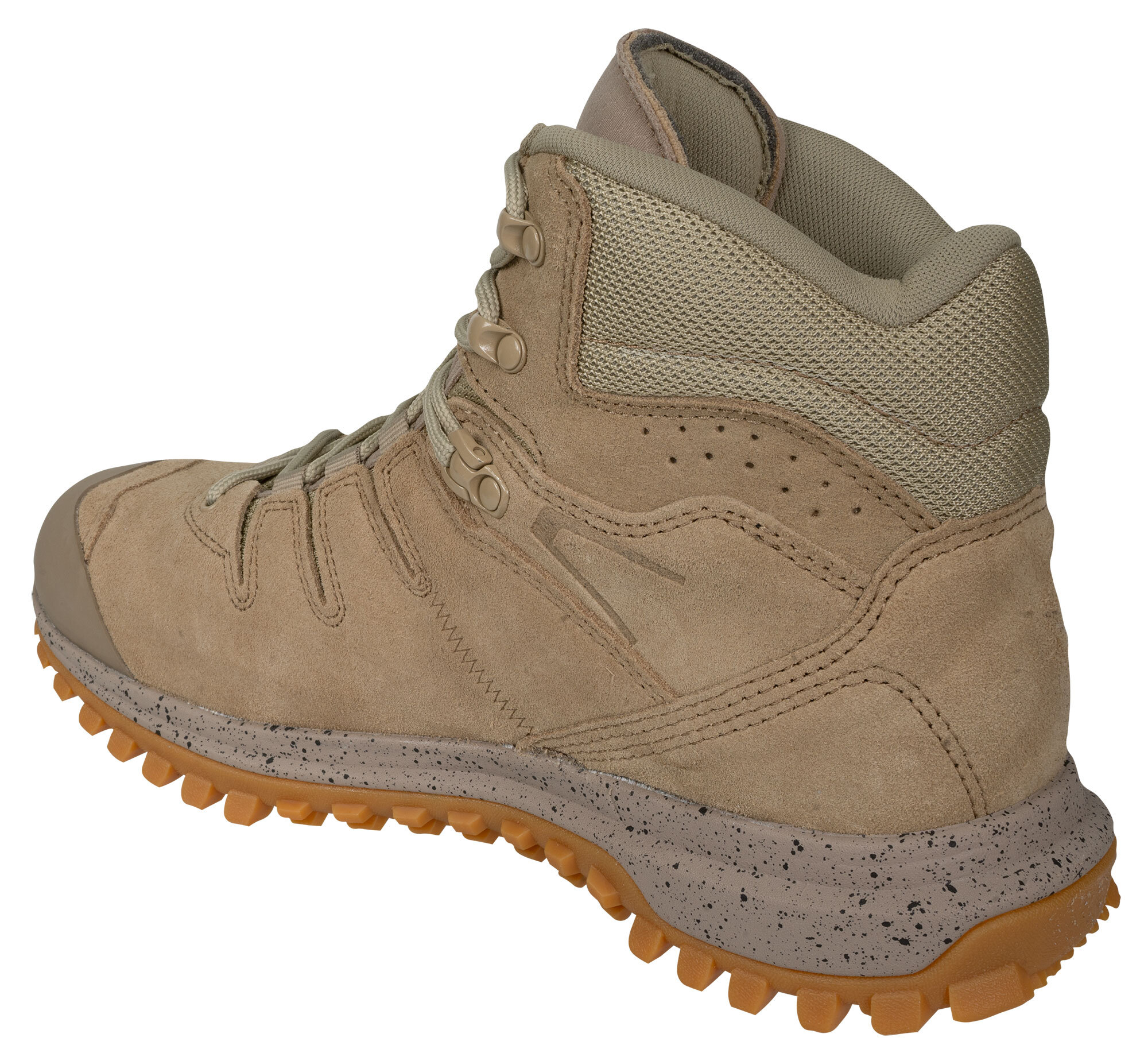 Высококачественные ботинки для пустынь и тропиков особенно удобны и идеально подходят для теплого и влажного климата. Треккинговые ботинки очень прочные и водонепроницаемые, но при этом идеально подходят для жаркого климата. Замша, используемая для верха, и синтетическая сетчатая ткань имеют очень высококачественную отделку. Материалы делают ботинок прочным, но в то же время очень гибким. Кроме того, ботинок хорошо пропускает воздух, но благодаря плотной ткани песок все равно не может проникнуть через сетку внутрь. Чтобы избежать неудобного давления на подъем, язычок ботинка снабжен подкладкой. Благодаря мембране Gore-Tex ноги остаются сухими и в обуви обеспечивается хороший микроклимат для ног.