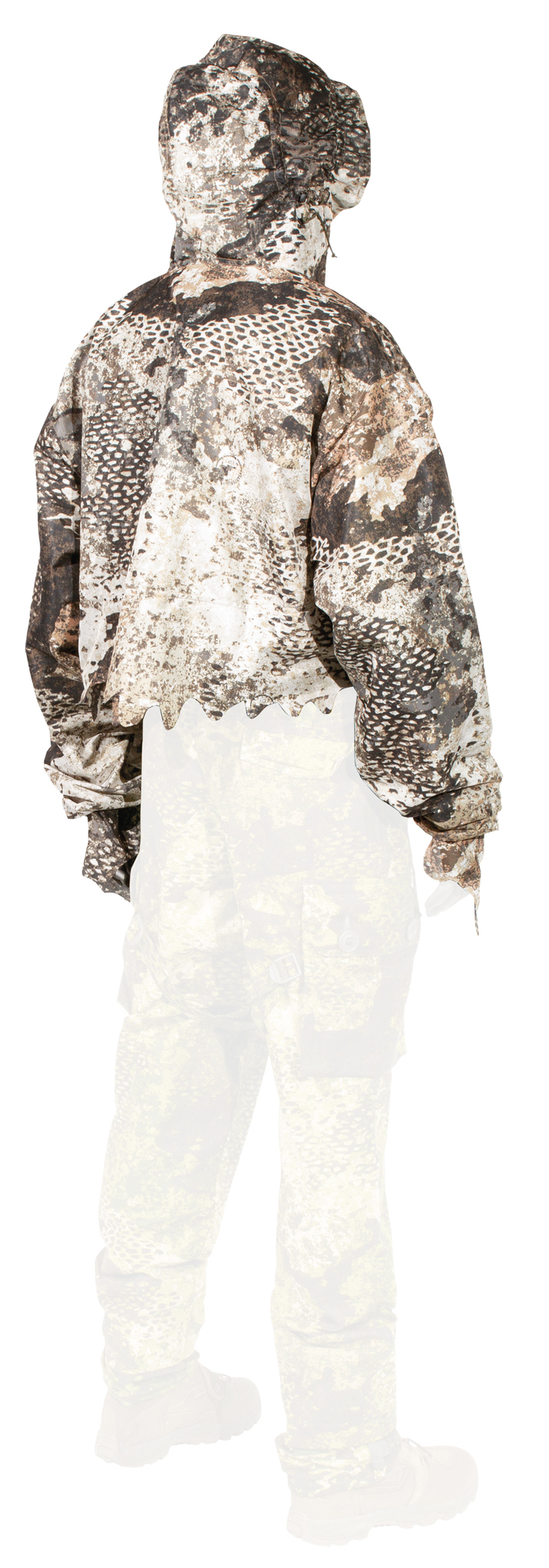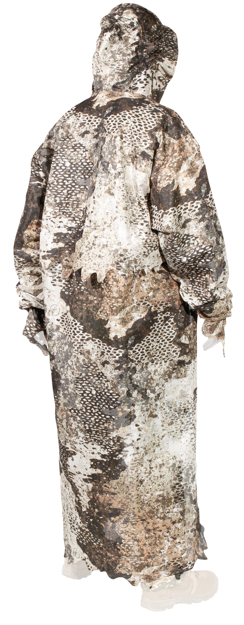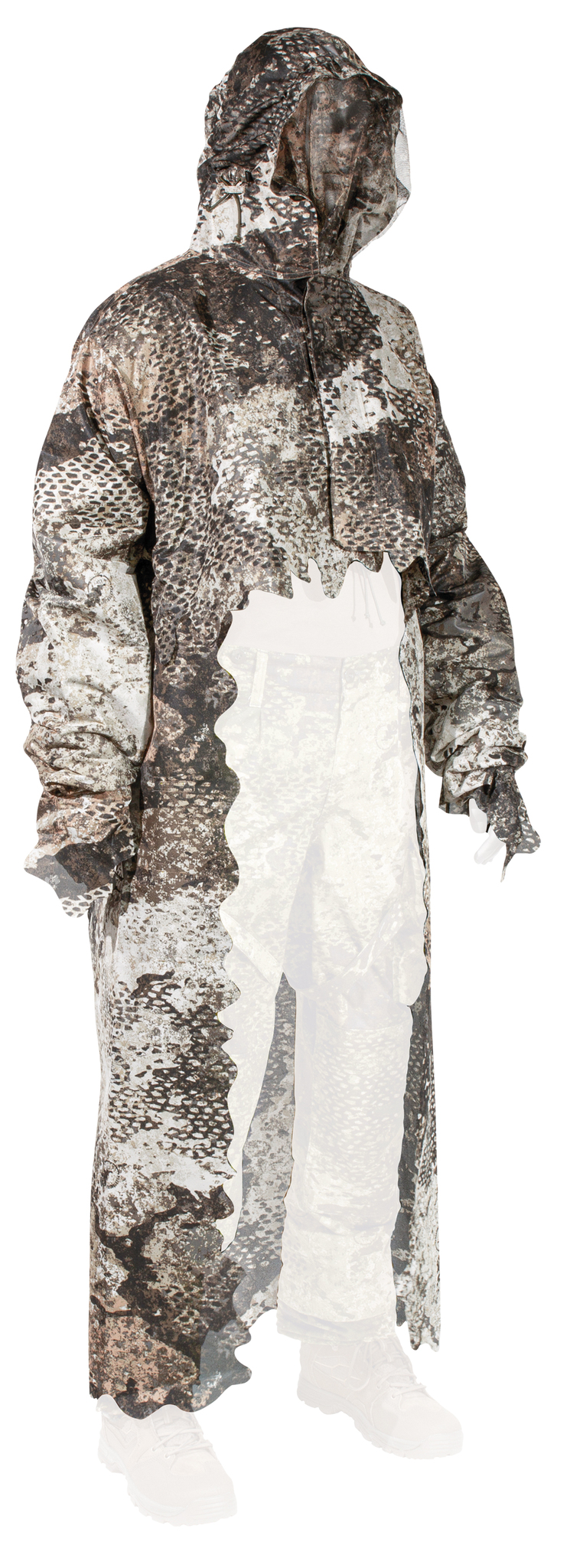 The back part can be unbuttoned and thus used separately as a small camouflage net, thus the top part can be used as a light camouflage jacket. The back piece can also be buttoned to the front of the cape, allowing you to be completely camouflaged when observing to the front