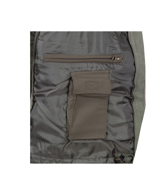 Zippered Napoleon pocket with elastic webbing and cable opening.