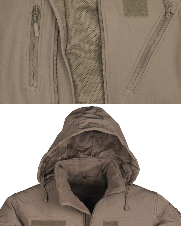 - Stand-up collar with fleece lining and integrated hood