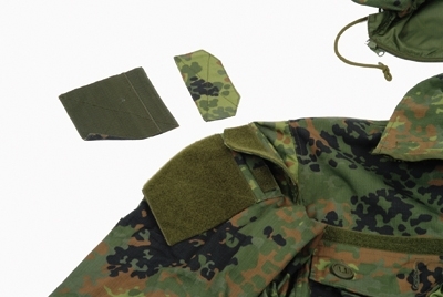 two slanted upper arm pockets, divided into two sections, camouflage Velcro patch can be removed to provide a Velcro area for ID and other badges,