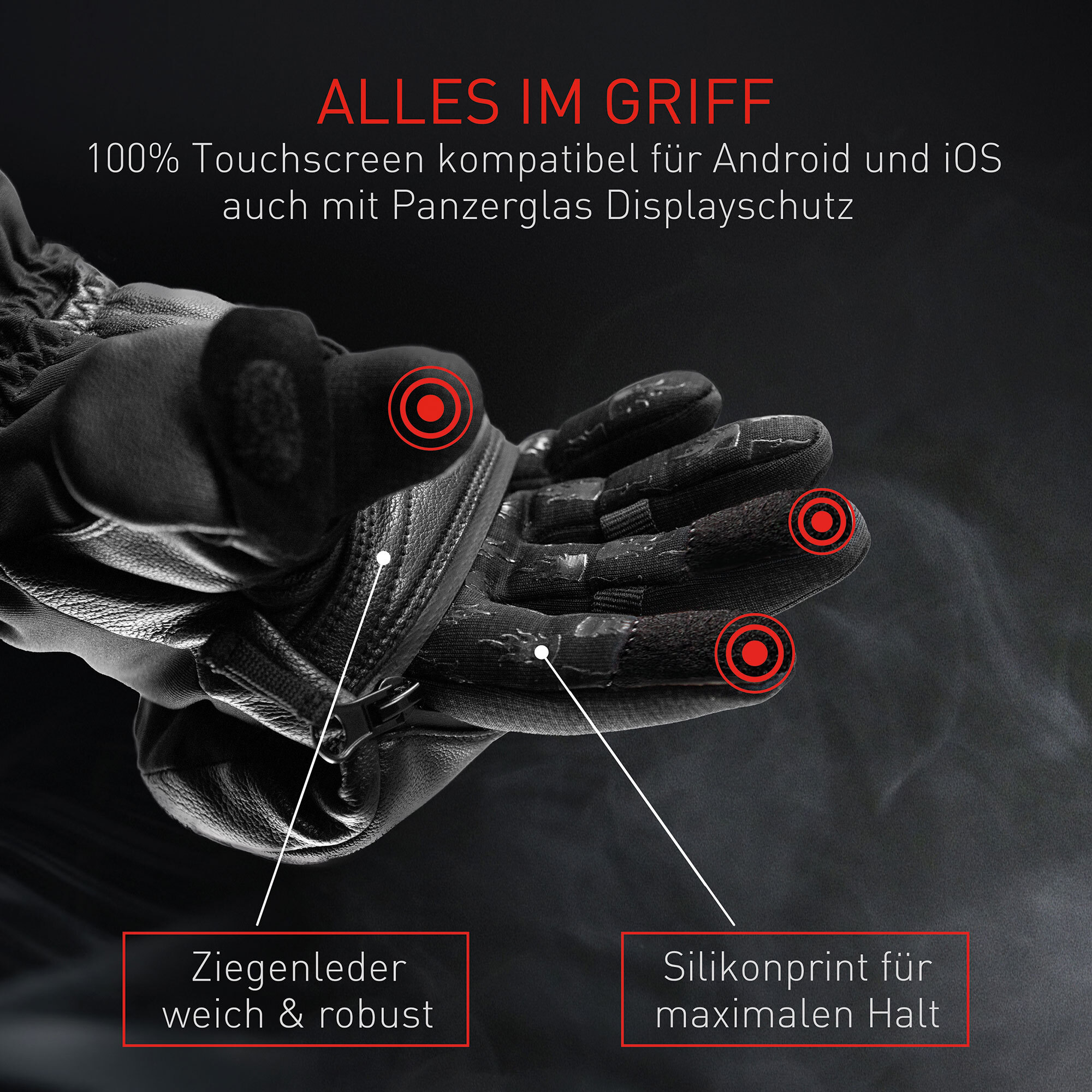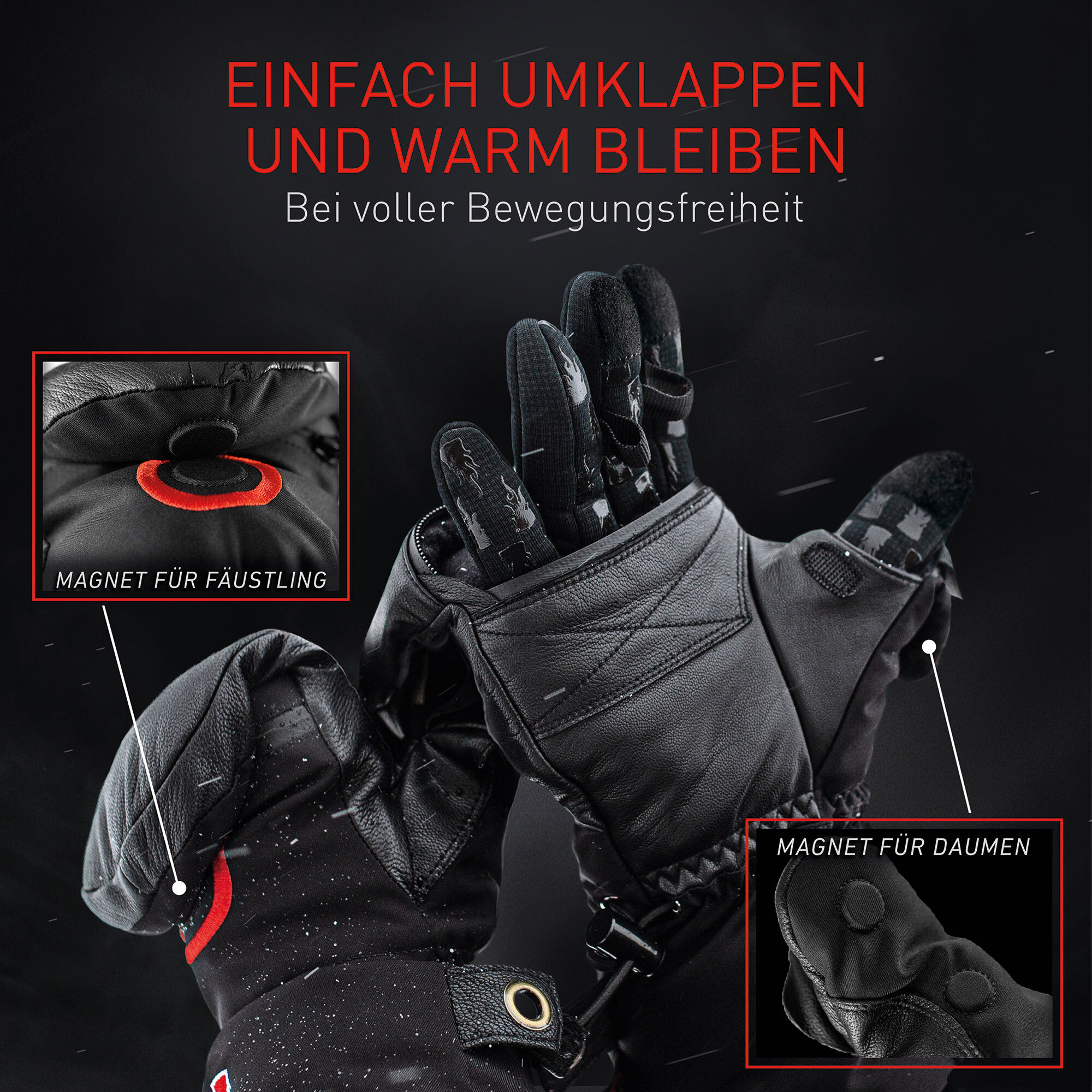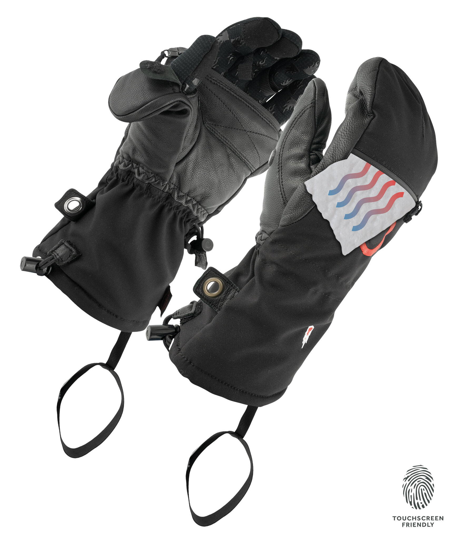 The successful model Heat 3 Smart even warmer and in premium version The Heat 3 Smart PRO from The Heat Company has on thumb and index finger right and left are equipped with silver textile for perfect operation of touch screen cell phones. The inner glove is made of wind & water repellent Polartec® Wind Pro®. The palm is completely made of high quality goatskin for more warmth and better grip. The entire cuff area was provided with additional 120 g Primaloft padding, for even more warmth. In the HEAT 3 SMART PRO, the inner glove and mitten are firmly sewn together. Tested skin compatibility: OEKO-TEX® STANDARD 100 certified. Sustainable production: bluesign® certified.