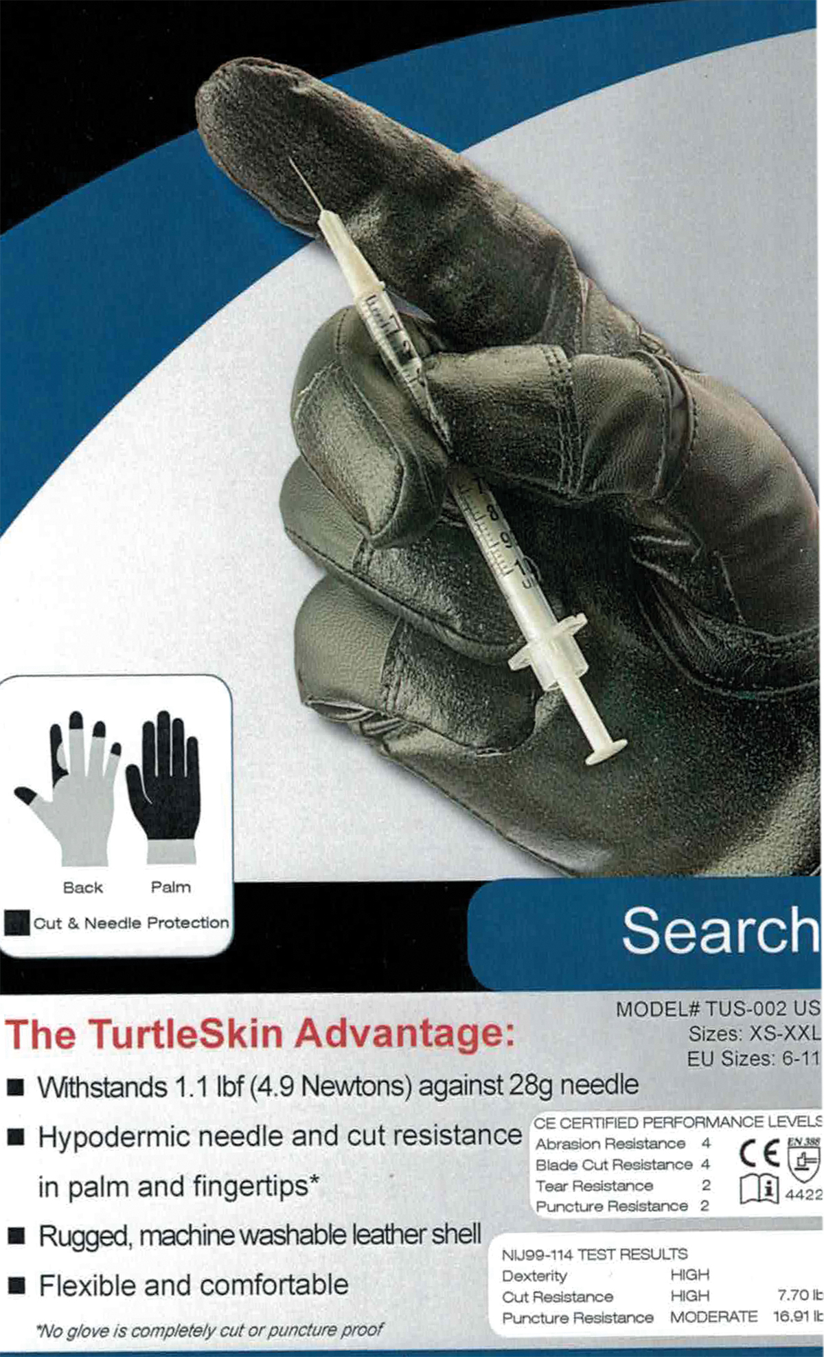 The TurtleSkin Search is a full leather search glove with excellent protective properties against punctures and cuts