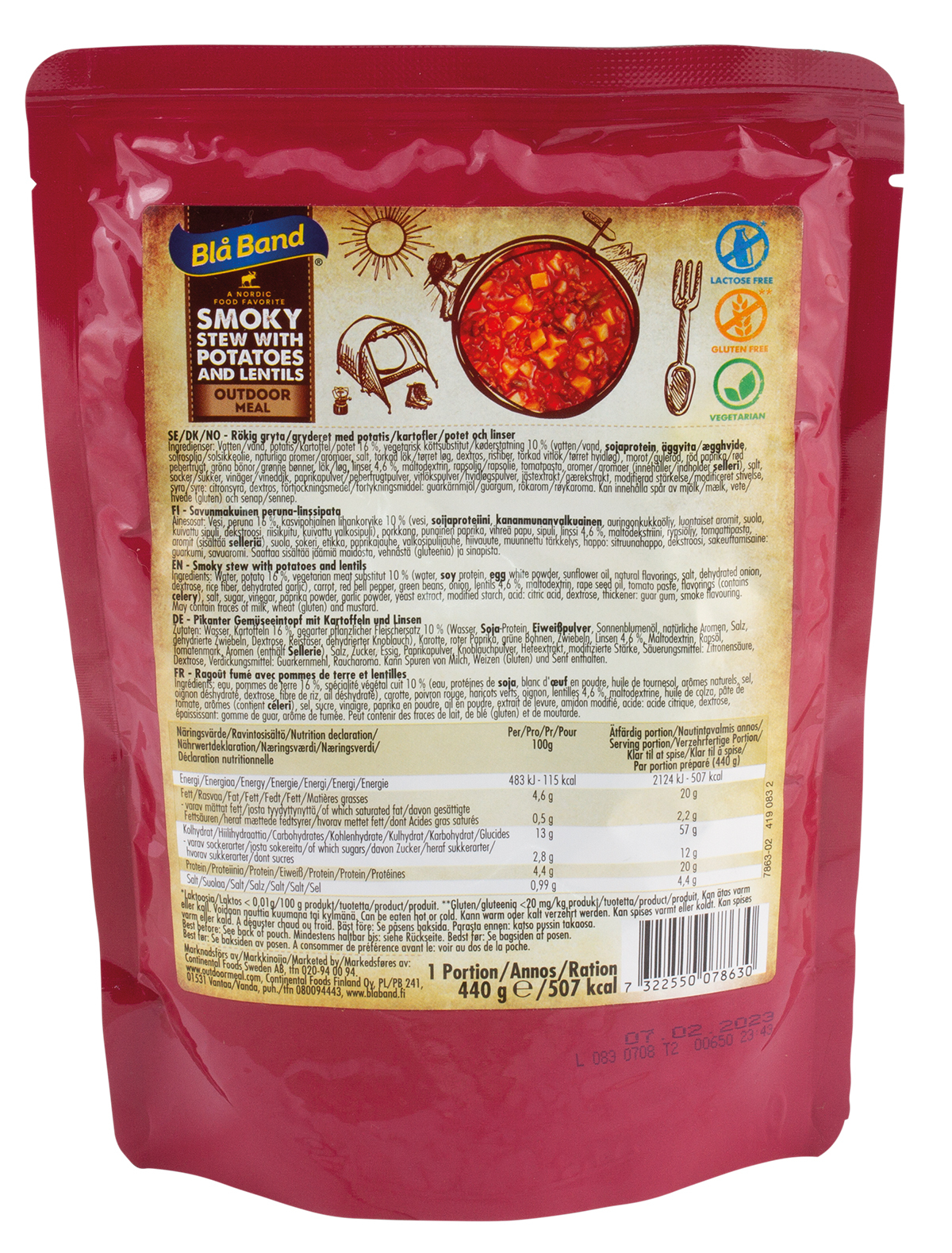Bla Band Outdoor Meal "Wet Pouch" trekking meal does not require the addition of water. It can be eaten hot and cold. Optionally prepare the contents of the pouch classically in the pot or directly in the package. The closed bag can be heated in hot water without affecting the taste or releasing substances from the bag.