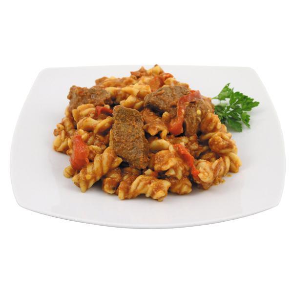 Состав: 75% гуляш (50% говядина), лук, перец, помидоры, томатная паста, молоко, сметана, перец, сахар, соль, приправа, 25% макароны (пшеничная мука, яйца, крупа).