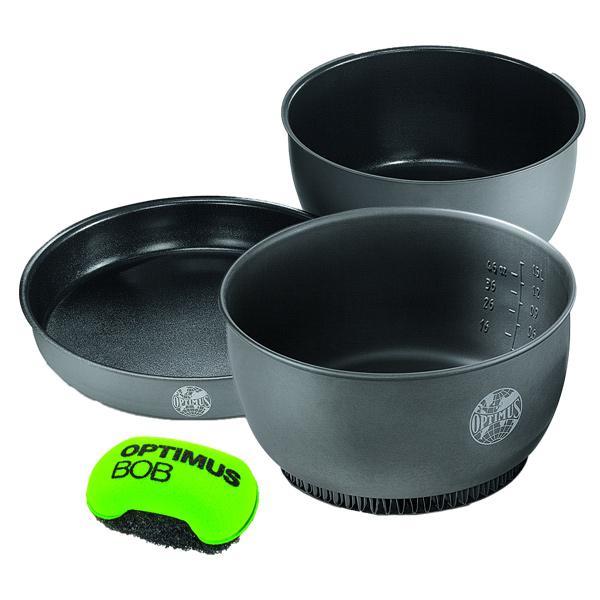 Кухонный набор от Optimus для кемпинга и пходов. Кастрюли выполнены из анодированного алюминия с антипригарным покрытием. .