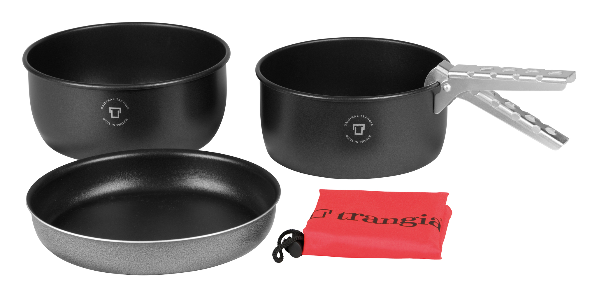 To complement camping stoves Trangia has produced a set that is sold without burners, suitable for gas stoves. The pots and pans have a milled bottom so they do not slip on the gas stove. This set is ideal for boats, caravans or vacation cabins. The cooking pots are the same as in the 25 series, but the frying pan is a different version and does not fit on Trangia stove sets. The frying pan has a 1.4 mm bottom, which makes it very robust.