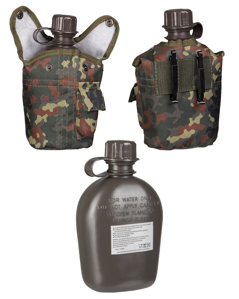 Replica of the classic US canteen with canteen cover. The canteen cover with snap closure has a small patch pocket with Velcro closure and ALICE fastening clips on the back.