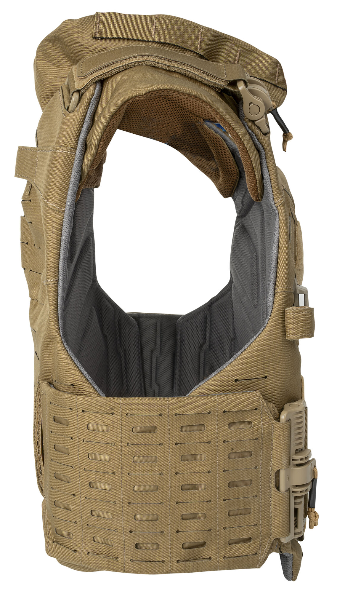 Removable collar/shoulder insert provides padding of mesh material. Inside, the plate carrier is fully lined with mesh material, and there are separate compartments for plates and soft ballistics. Under the cummerbund the plate carrier is cut a bit wider for soft ballistics, here 1 x 6 + 1 x 4 lasercut MOLLE have been processed on the wings. Buckles are available for optional front panels.