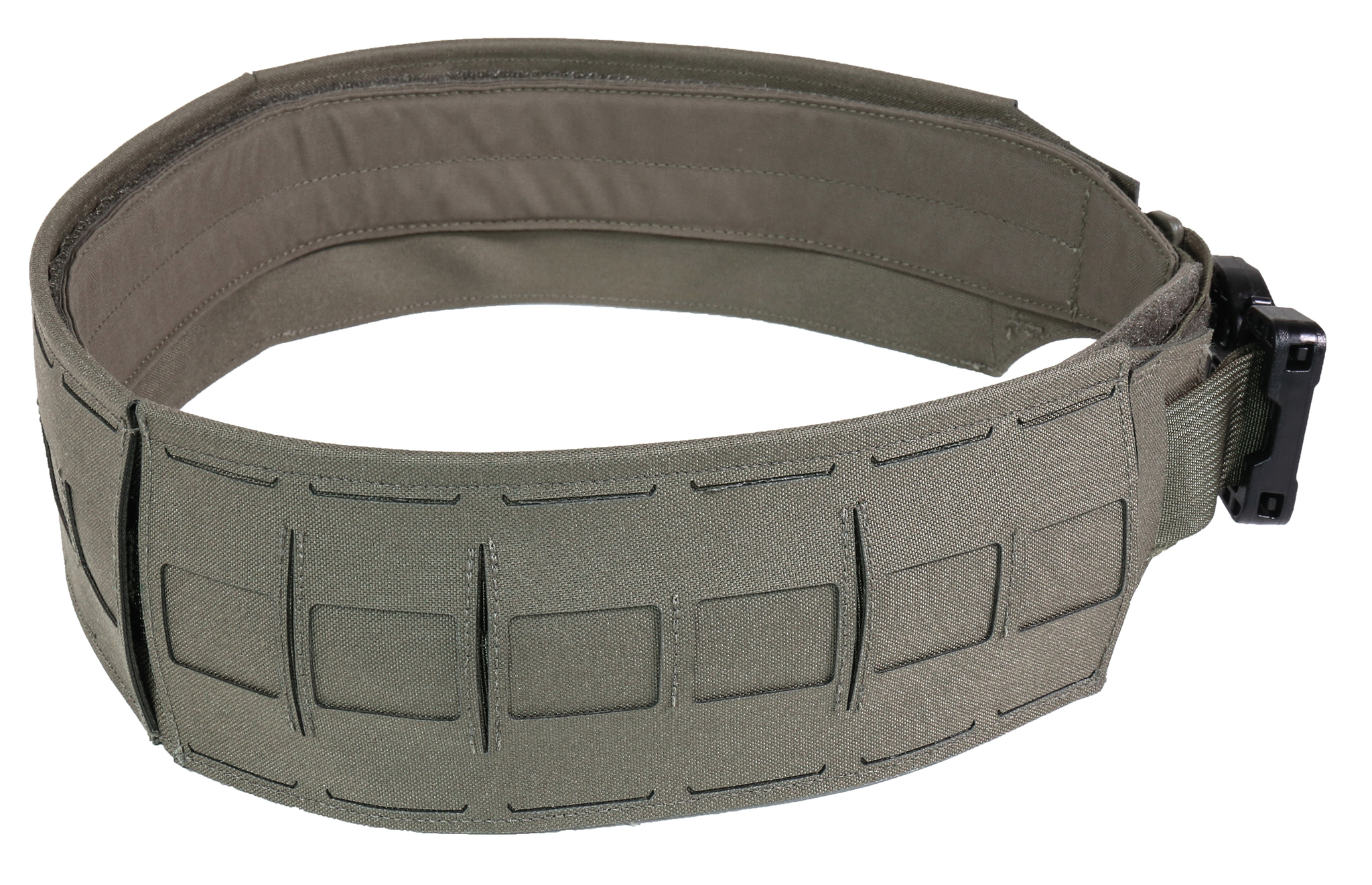 Modular belt with 3 laser cut MOLLE panels on the outside.