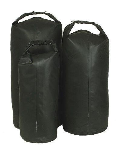 Pack sacks with roll closure and pin buckle for dry stowage of equipment, clothing, etc.