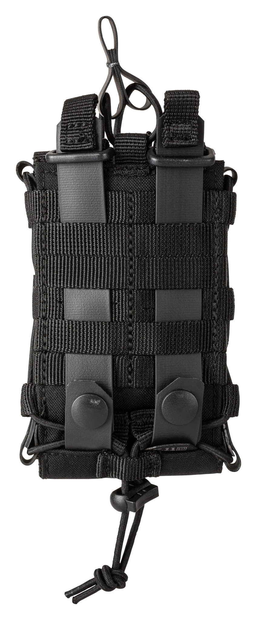 Laser cut MOLLE loops are attached to the front of the 5. 11 Tactical Flex Single Multi - Caliber Mag Bungee Pouch for additional accessories. Flex-HT™ technology provides versatile attachment options and facilitates threading on all attachment platforms with water-resistant TPU-coated straps. The front and bottom are made of double-layer 500D nylon for increased durability. An optional tether system with elastic cord is included. The drainage hole in the bottom prevents moisture build-up, and a reliable Duraflex® snap provides additional security. No matter the size of your magazines, 5.11 Tactical has the solution.