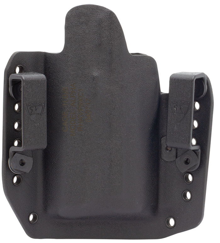 The DSG Arms Alpha Holster is a full-size OWB external waistband holster for daily duty and training use. The Alpha Holster is built pancake style and contoured to the body for comfort and concealed carry. It's made of virtually indestructible .93 Kydex 100 rather than the industry standard .080, which means it's a little thicker but even more scratch resistant than most other Kydex holsters.