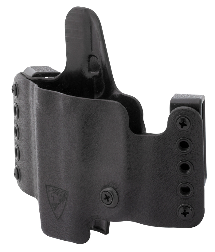 The streamlined DSG Arms Vertical outside waistband holster is built on the Alpha Holster. With its minimized shape, it still provides maximum comfort. resembles the Hot Rod "summer" version of other larger pancake-style holsters. The vertical, non-tilt grip angle was added as an option based on customer feedback and is suitable for IDPA competition. It's made of virtually indestructible .93 Kydex 100 rather than the industry standard .080, which means it's a bit thicker but even more scratch resistant than most other Kydex holsters.