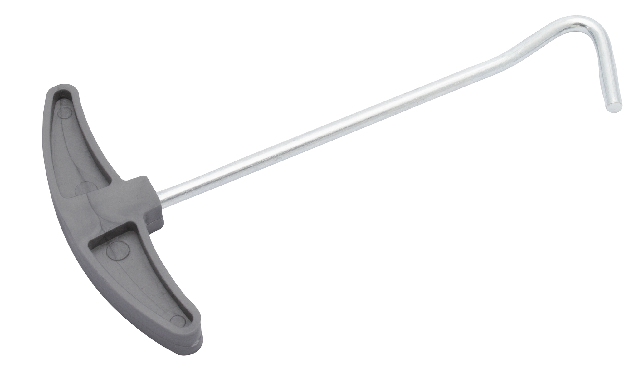 Tent peg pull-out aid made of steel with handy plastic handle.