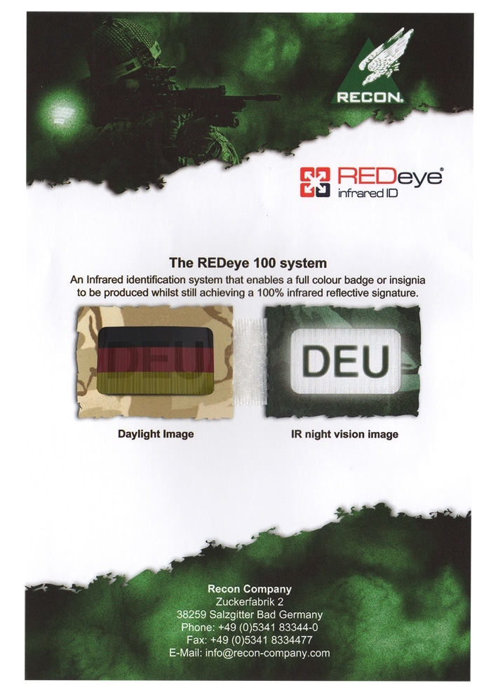 The RedEye 100 system allows custom requirements such as national sovereignty insignia, i.e. national flags or other insignia, to be reproduced exactly in the colors for daylight viewing, with 100% infrared reflection in the night vision range.