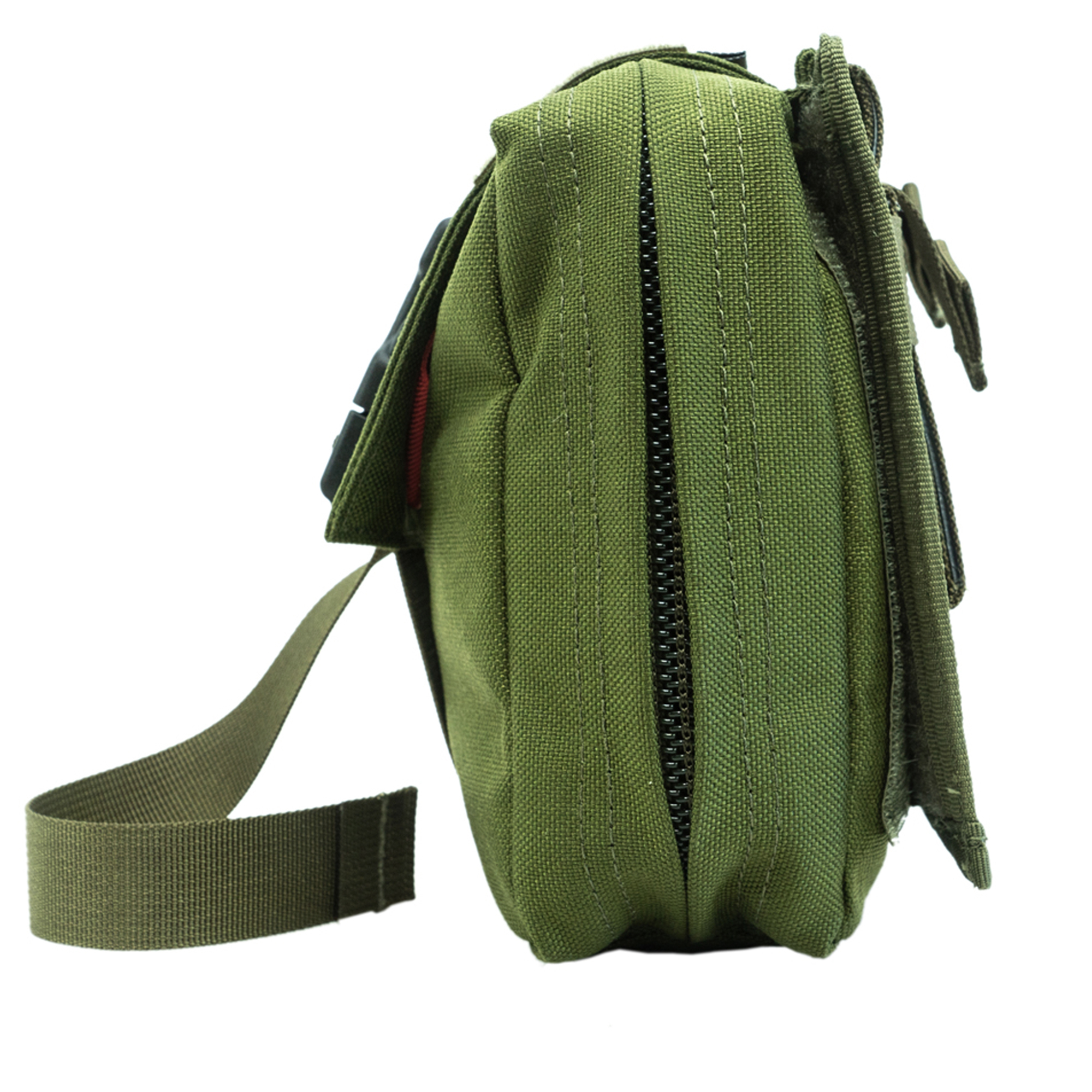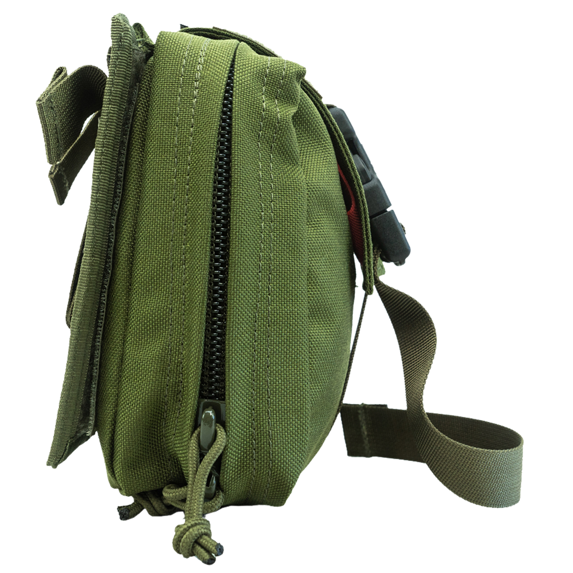 The design consists of two parts, a removable medical pouch with high visibility grab handle and a back plate with QR modular attachment. In normal use, the detachable pouch is attached to the back plate with Velcro and a buckle. When needed, the buckle can be released and the pouch can be pulled off to be carried or thrown to the victim and emergency scene. The modular QR-MOLLE system allows for quick on and off and secure attachment to MOLLE loops.