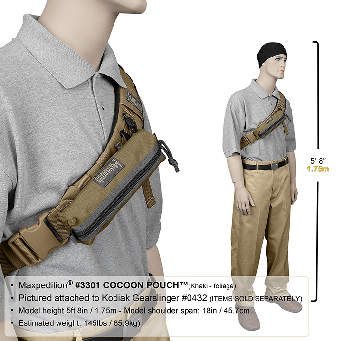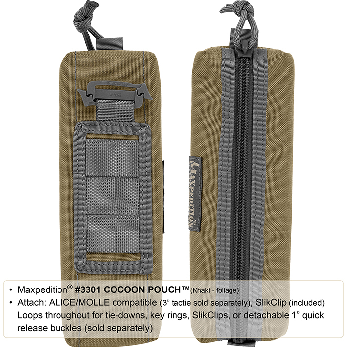 The Cocoon Pouch can be attached to MOLLE compatible backpacks and vests with a Maxpedition 3" TacTie Attachment Straps (sold separately, not included).