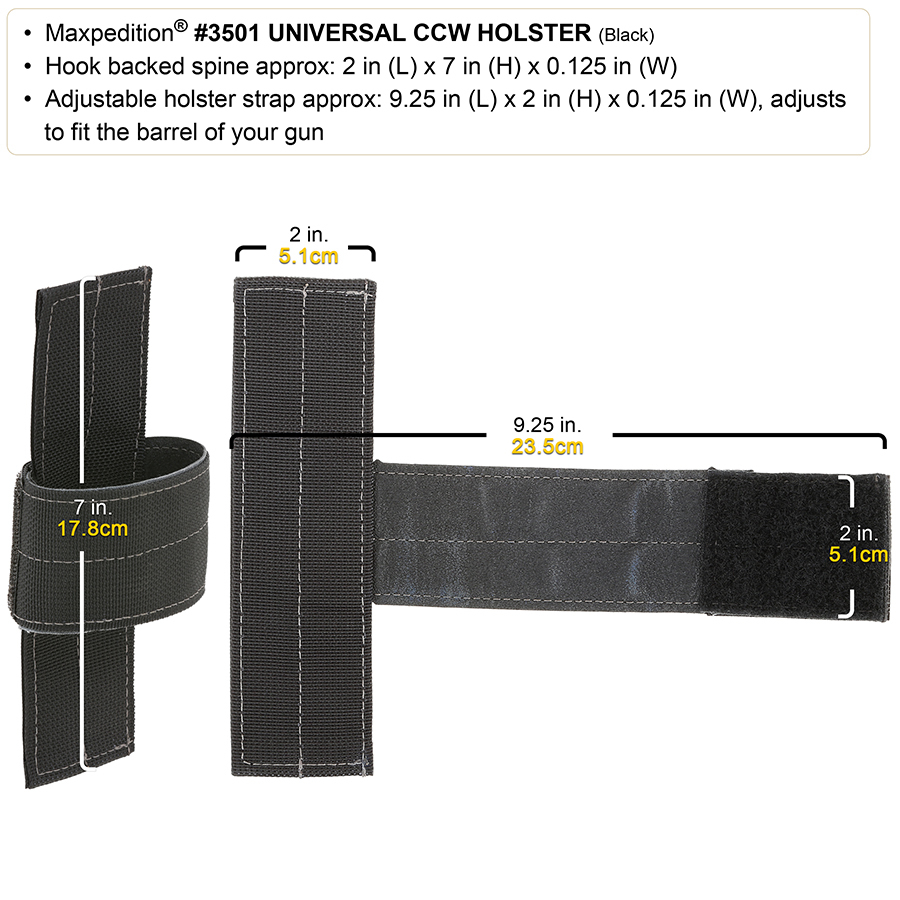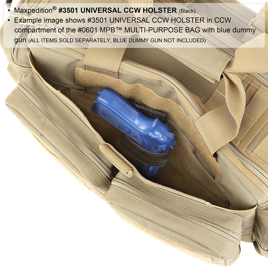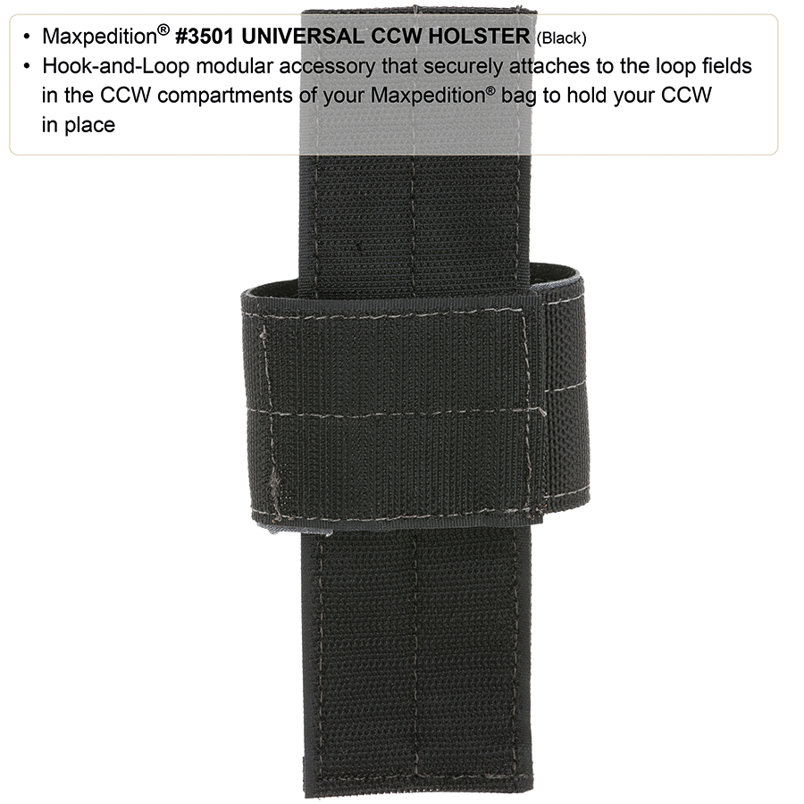 The Maxpedition Universal CCW Holster from the Legacy Series is a universal pistol holster with hook velcro back for attachment to Velcro flaps, such as those found in various Maxpedition bags and backpacks.
