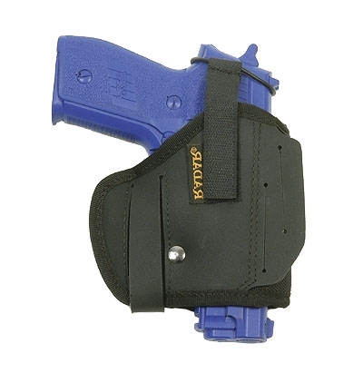 First class manufactured, high quality belt holster made of balistic nylon with internal guide rail. Fits universally for most service pistols. The safety can be customized or omitted altogether. The draw angle is selectable through two belt passages. Fits Glock 17,19, 20, 21, 22, 23, 25, 26, 27, 34 - Sig Sauer P220, P225, P226, P228, P229. Available for left or right handers