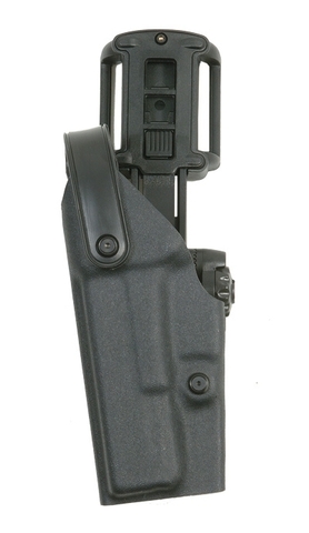 The duty holster 6400 made of thermoformed polymer is equipped with a patented forward folding safety closure, the shackle can also be locked to prevent unintentional opening.