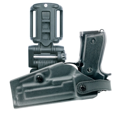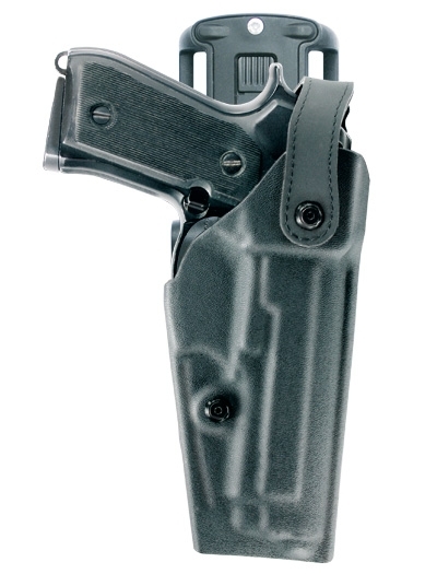 The duty holster 6400 made of thermoformed polymer is equipped with a patented forward folding safety closure, the shackle can also be locked to prevent unintentional opening.