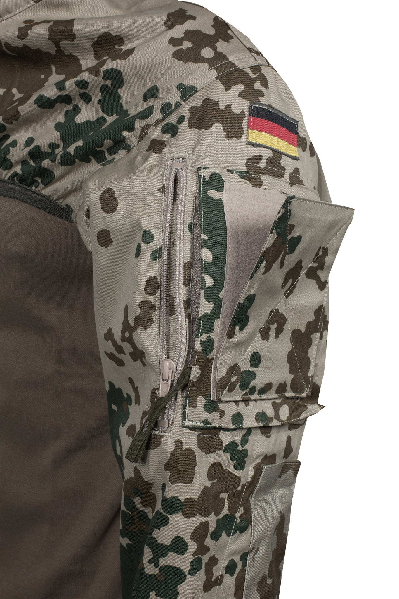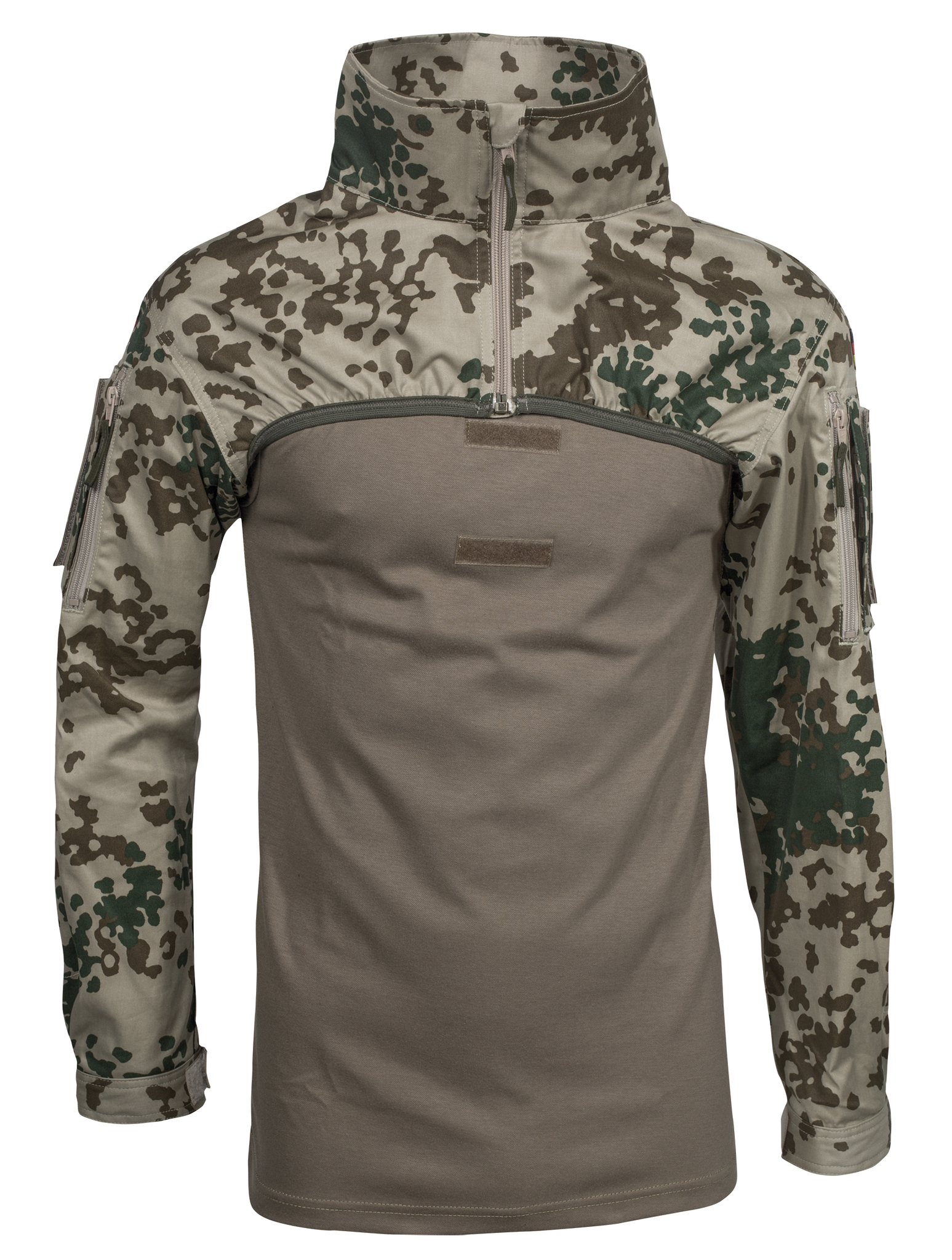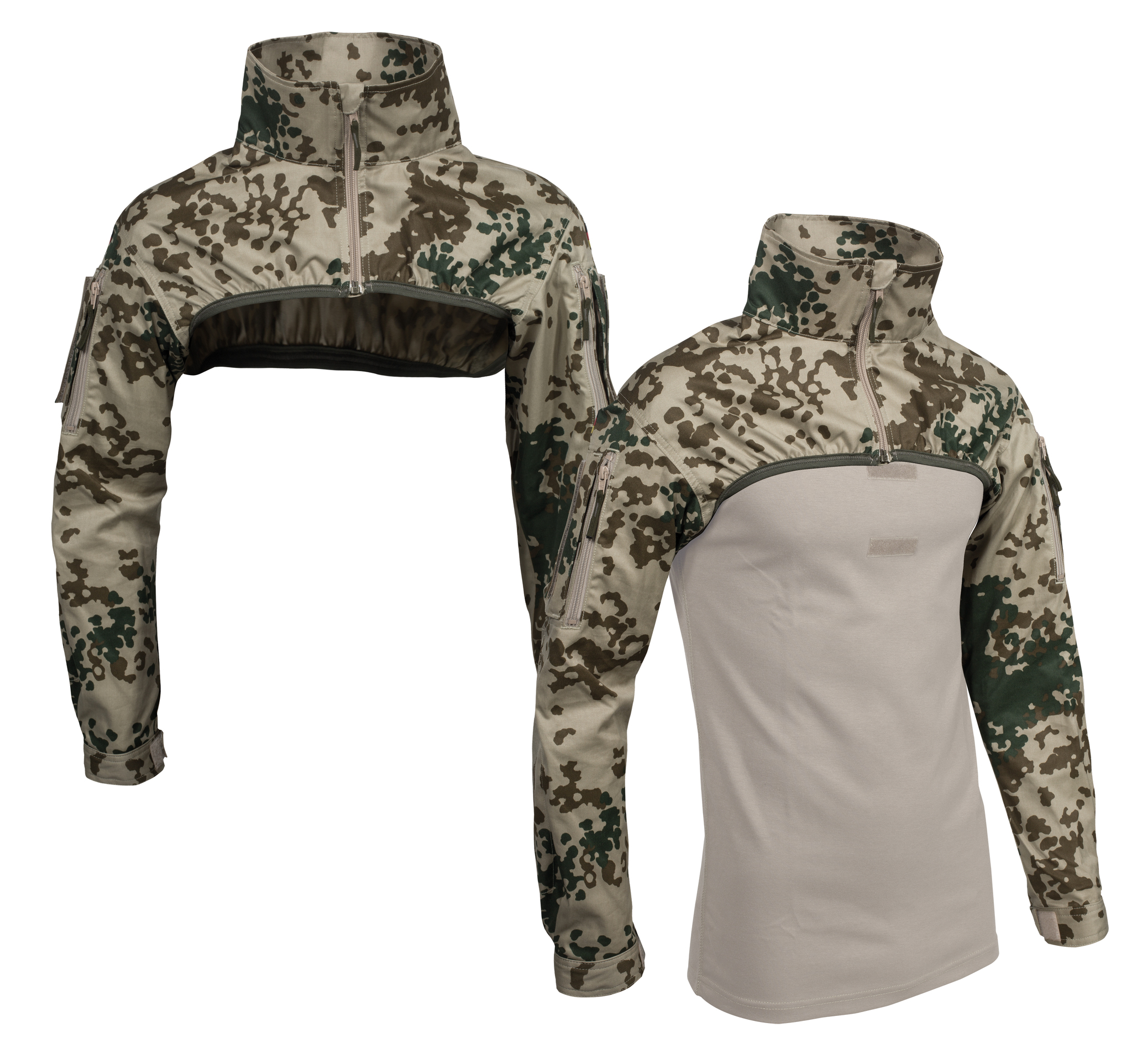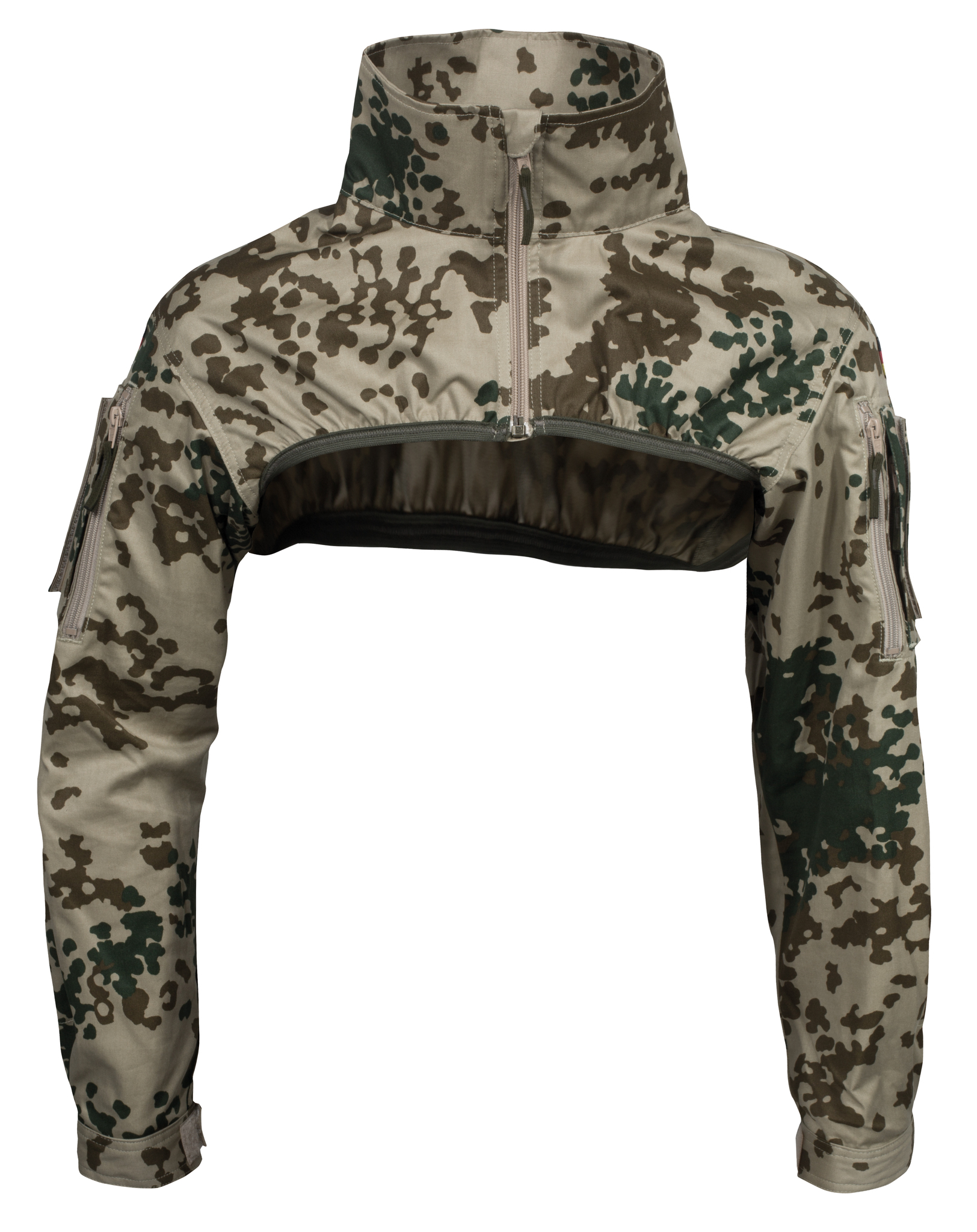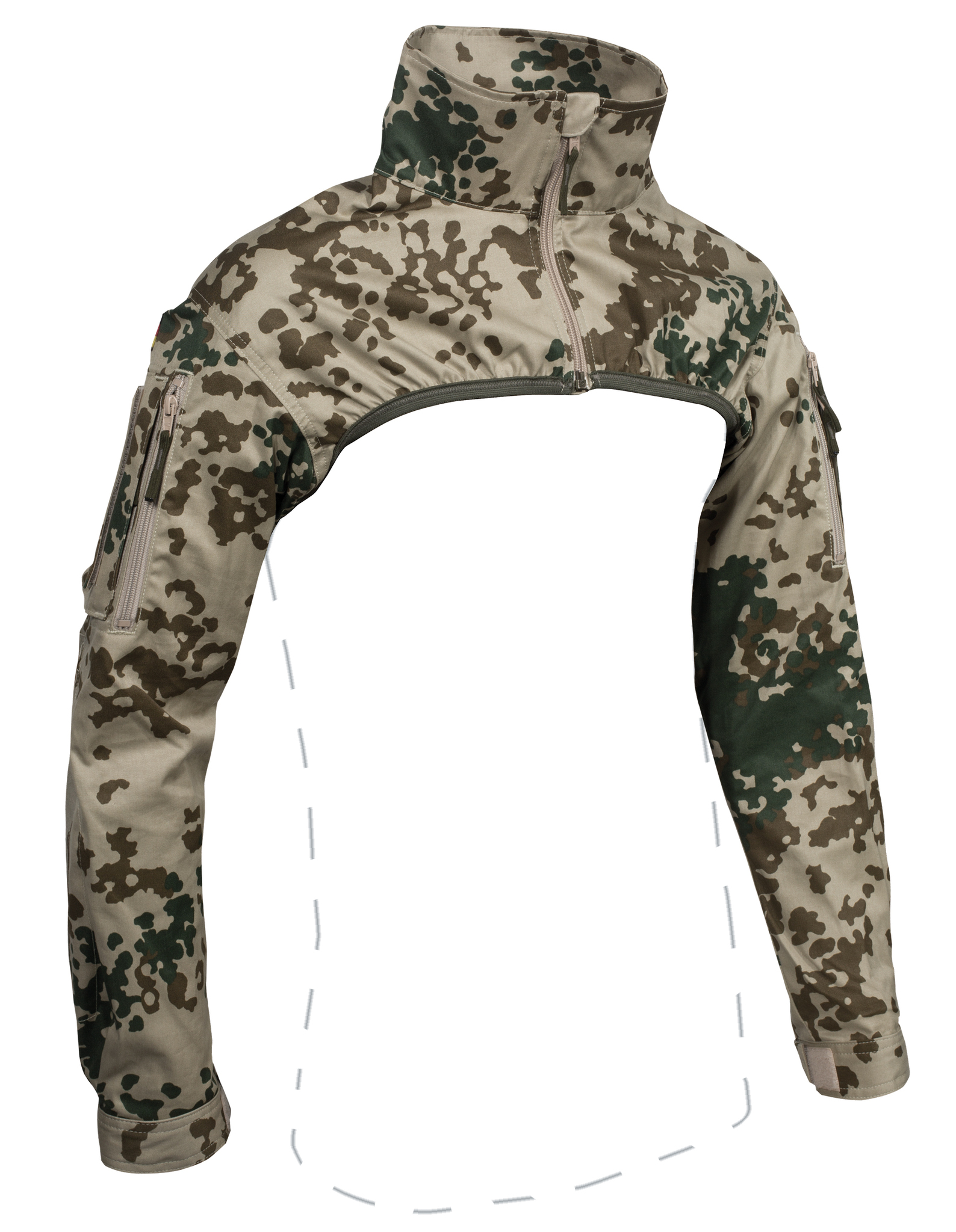 Unlike conventional combat shirts, the bolero has no sewn-on T-shirt, but consists only of the shoulder and sleeve area, with an elastic closure running around the chest and a front zipper that opens completely. This has the advantage that the bolero can be worn over different layers of clothing, depending on climatic or tactical requirements.