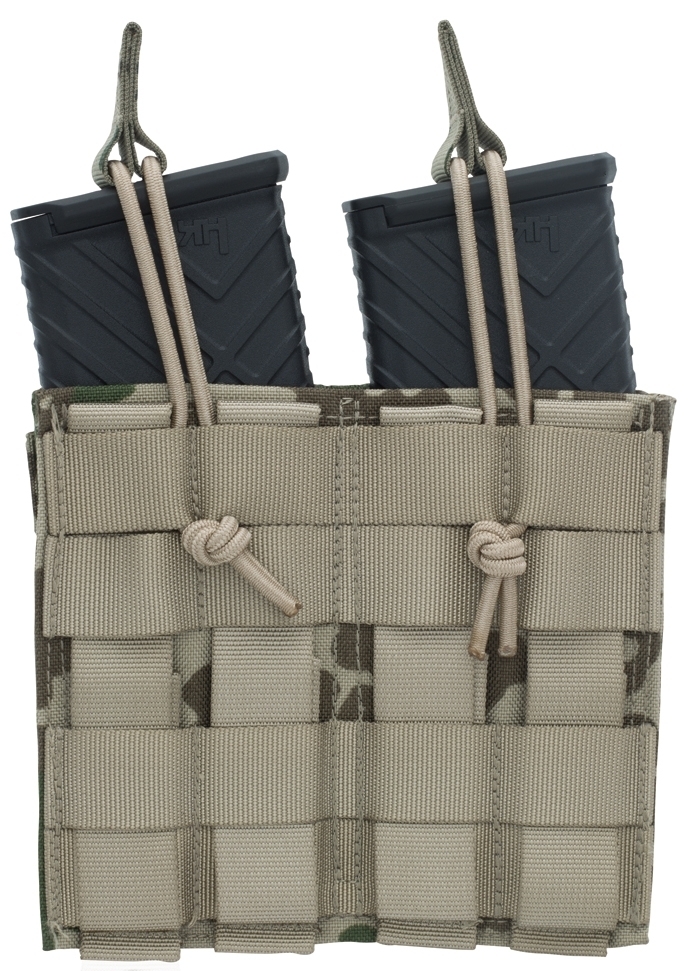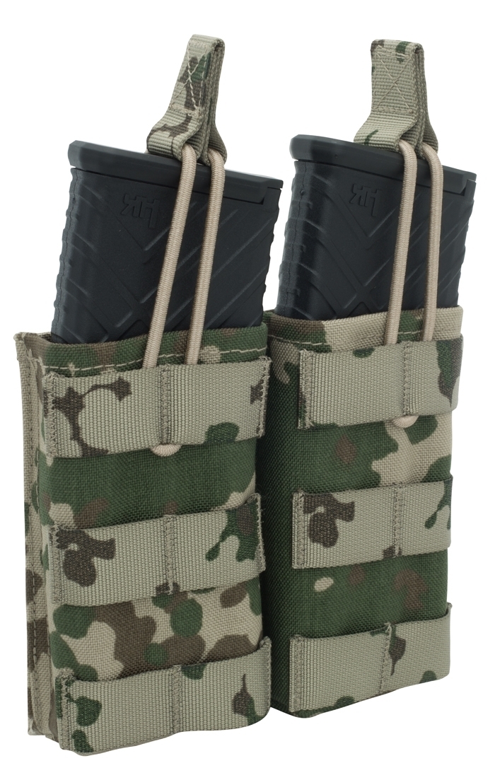 The RECON PRO double magazine pouch 5.56 manufactured according to TL of the German Army was developed for quick magazine change. The magazines are secured by bungee cords with easy-to-grip pullers. The plastic material inside additionally prevents the magazines from falling out, thus the pouch can be used with or without bungee cord security. On the back are four PALS attachment loops, with which the bag can be attached to all modular surfaces.