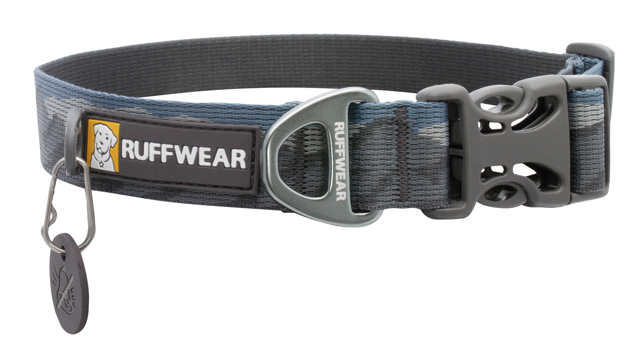 Ruff Wear® Crag™ collar is made of durable Tubelok™ nylon webbing (specially woven tubular webbing) with reflective elements and aluminum V-ring. The aluminum ring is easy to grip due to its shape, making it easier to attach the leash. There is a silicone washer on the key ring which reduces the rattling of the dog tags.