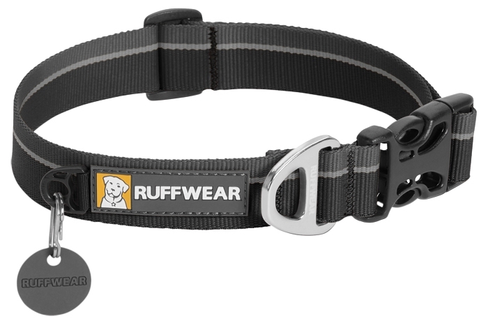 The Ruff Wear® Hoopie™ collar is made of durable Tubelok™ nylon webbing (specially woven tubular webbing) with an aluminum V-ring. The aluminum ring is easy to grasp due to its shape, making it easier to attach the leash. There is a silicone washer on the key ring which reduces dog tag rattling.