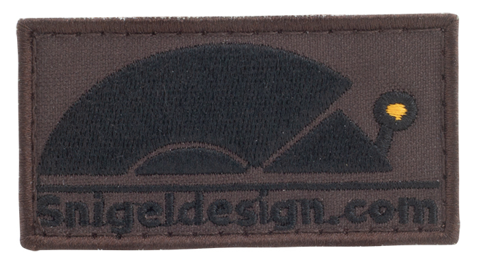 Embroidered SnigelDesign patch with hook and loop backing.