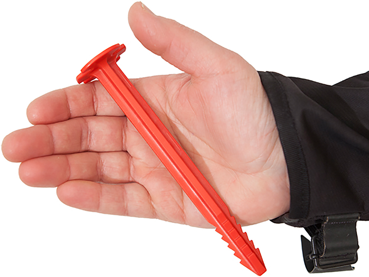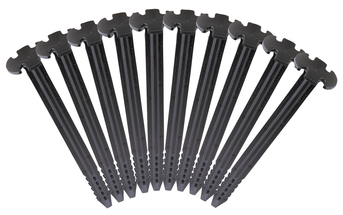 The BlackFisk tent pegs from PiranhaREC are made of a 100% recycled plastic - Made in Switzerland. They offer many advantages over conventional metal pegs: they are ultra-light, super safe and also protect the environment. This recycled plastic peg is also forgiving to hammering with a hammer, axe or stone - there are no sharp edges that damage the tent fabric