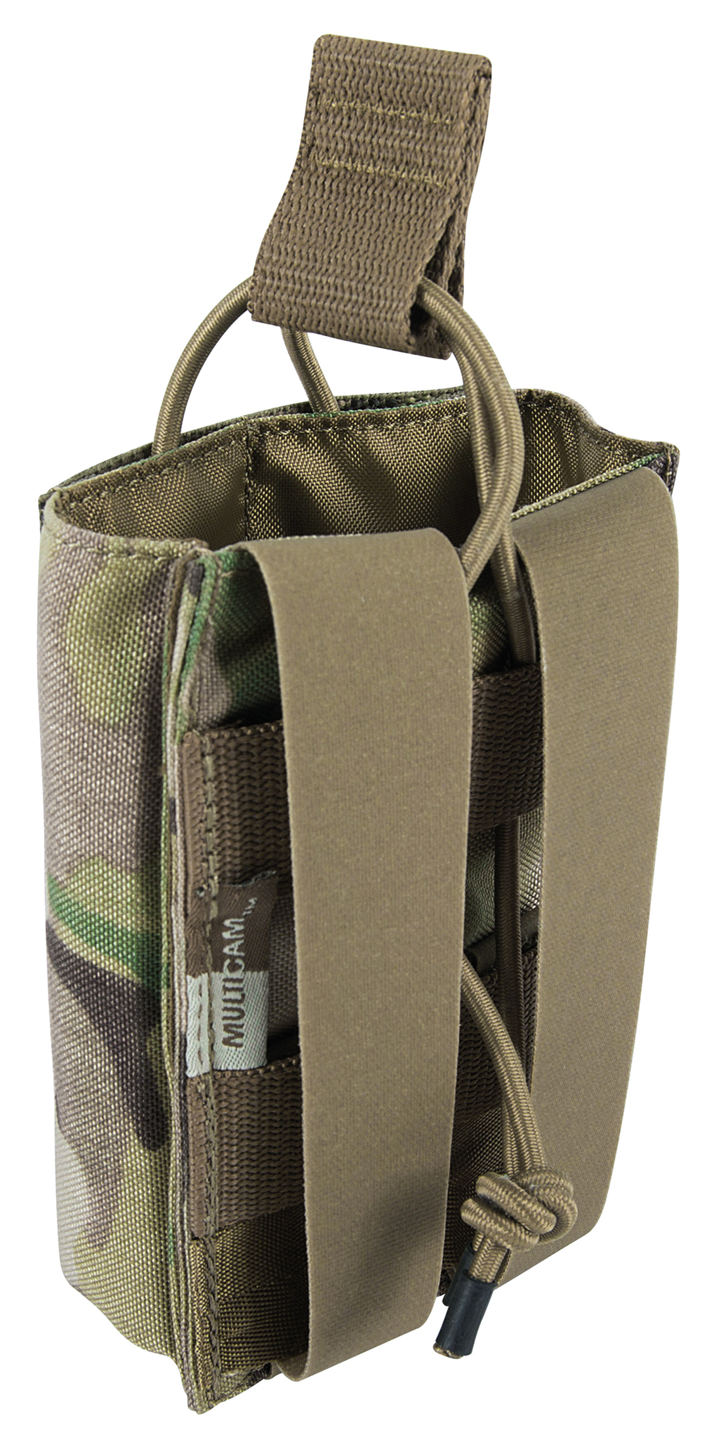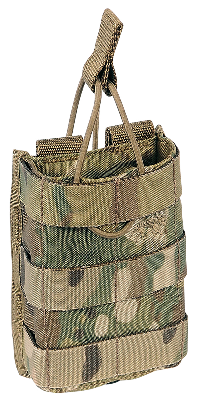The Tasmanian Tiger SGL Mag Pouch BEL MKII is a short magazine pouch designed to hold one H&K G36 magazine, secured by bungee cord. The pouch attaches using the quiet and durable MOLLE reverse system made of Hypalon.