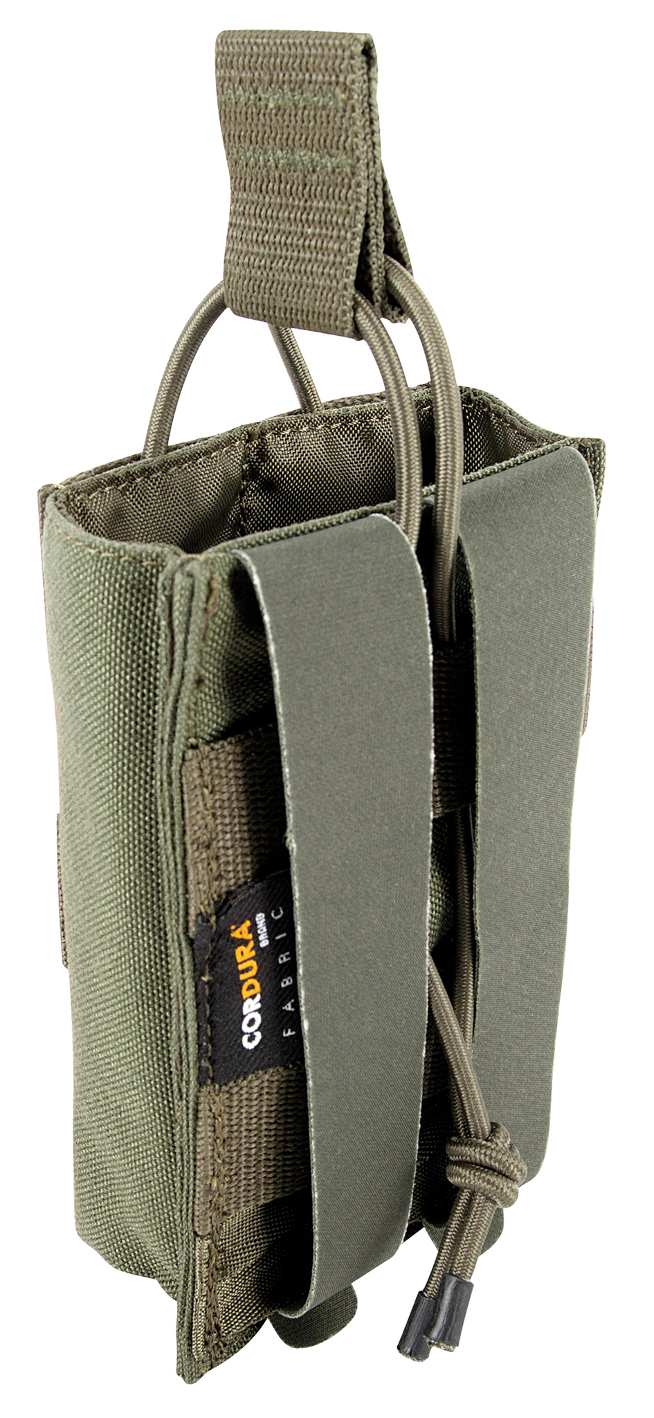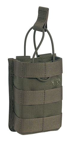The Tasmanian Tiger SGL Mag Pouch BEL G36 MKII is a short magazine pouch designed to hold one H&K G36 magazine, secured by bungee cord. The pouch attaches using the quiet and durable Hypalon MOLLE reverse system