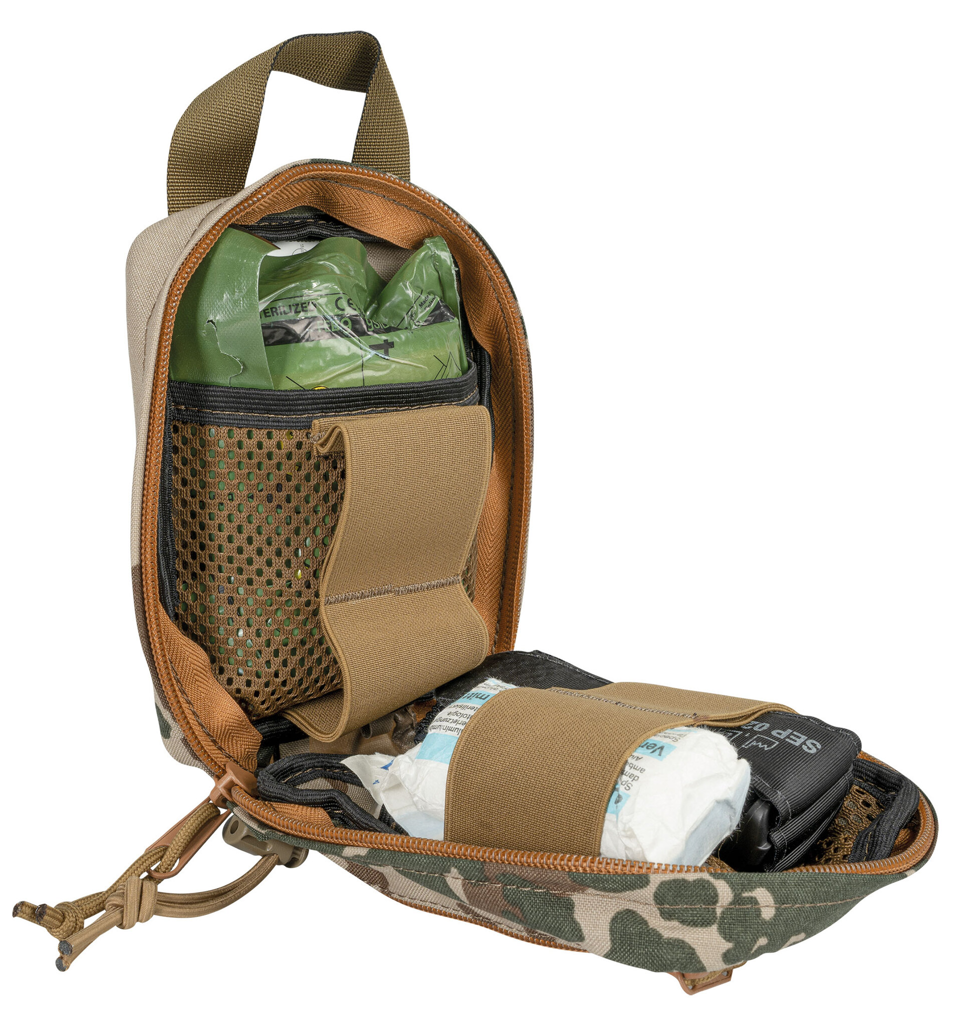 The First Aid Pouch features a laser cut cross of fleece velcro for identification and a vertical zipper pocket for flat items on the front.The First Aid Pouch is operated with two perimeter zippers with paracord straps, inside is divided for medical equipment.