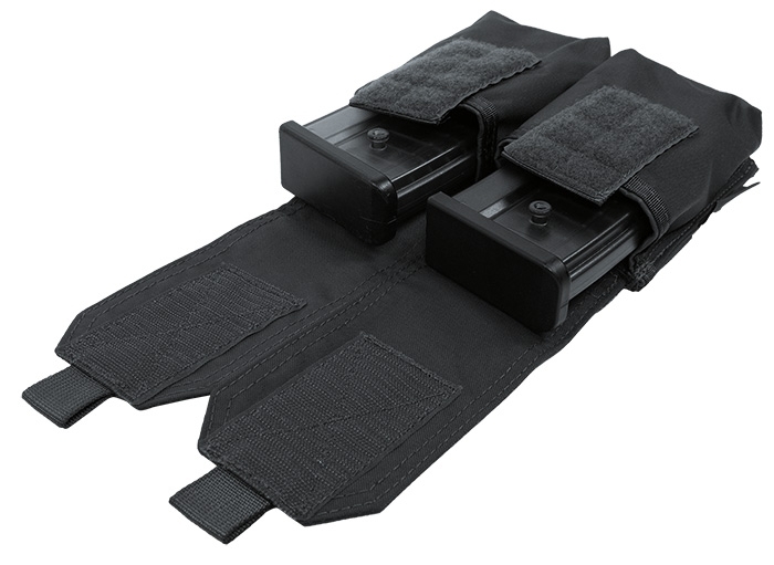 the magazine covers can be velcroed to the back of the bag for quick magazine change.
