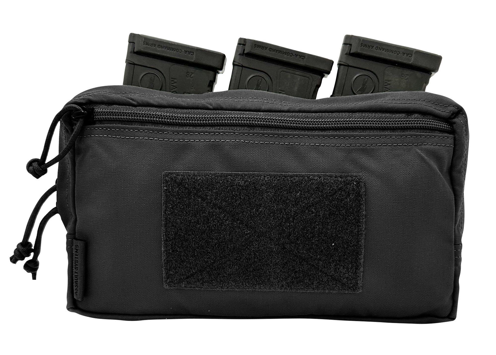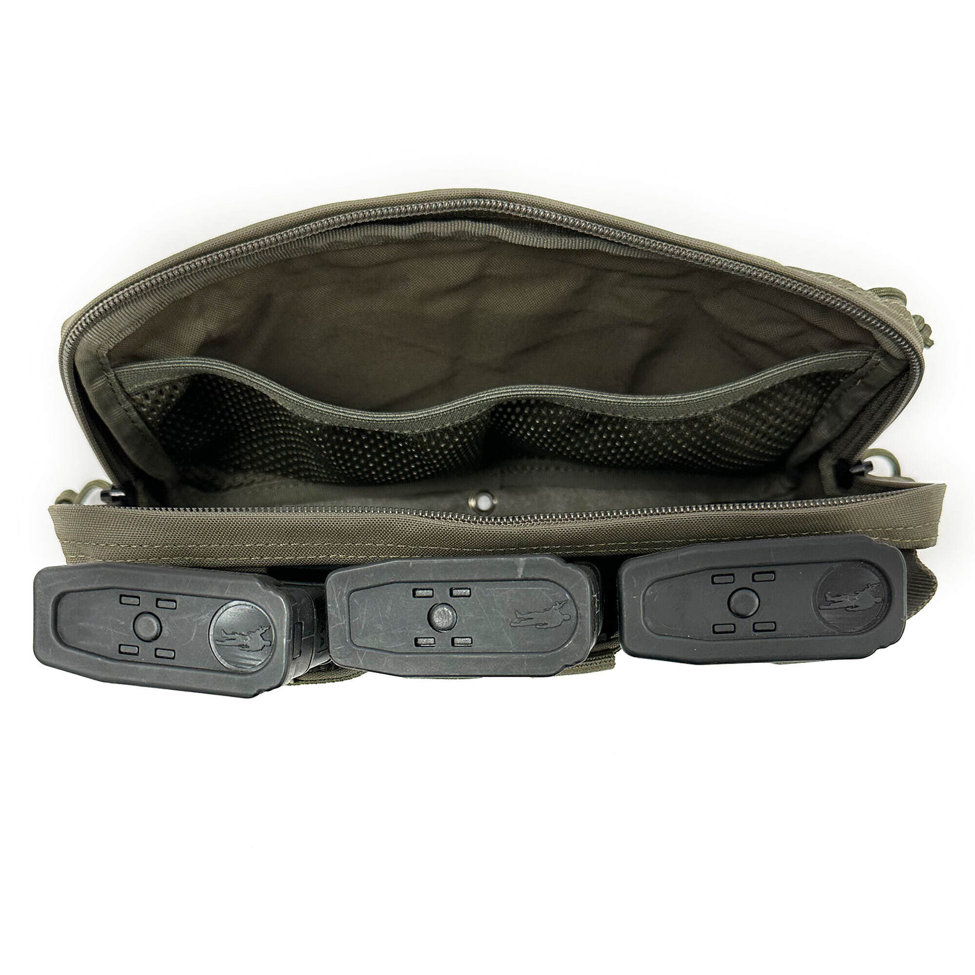 The rear section holds 3 x 5.56mm or 3 x 7.62mm x 39mm AK magazines in Warrior's secure thermoplastic inserts for quick access. On the front is a large 2 zippered pocket for general purpose storage and a wide range of mission specific gear including medi-kit, navigation aids, gloves, multitools, admin and maps.